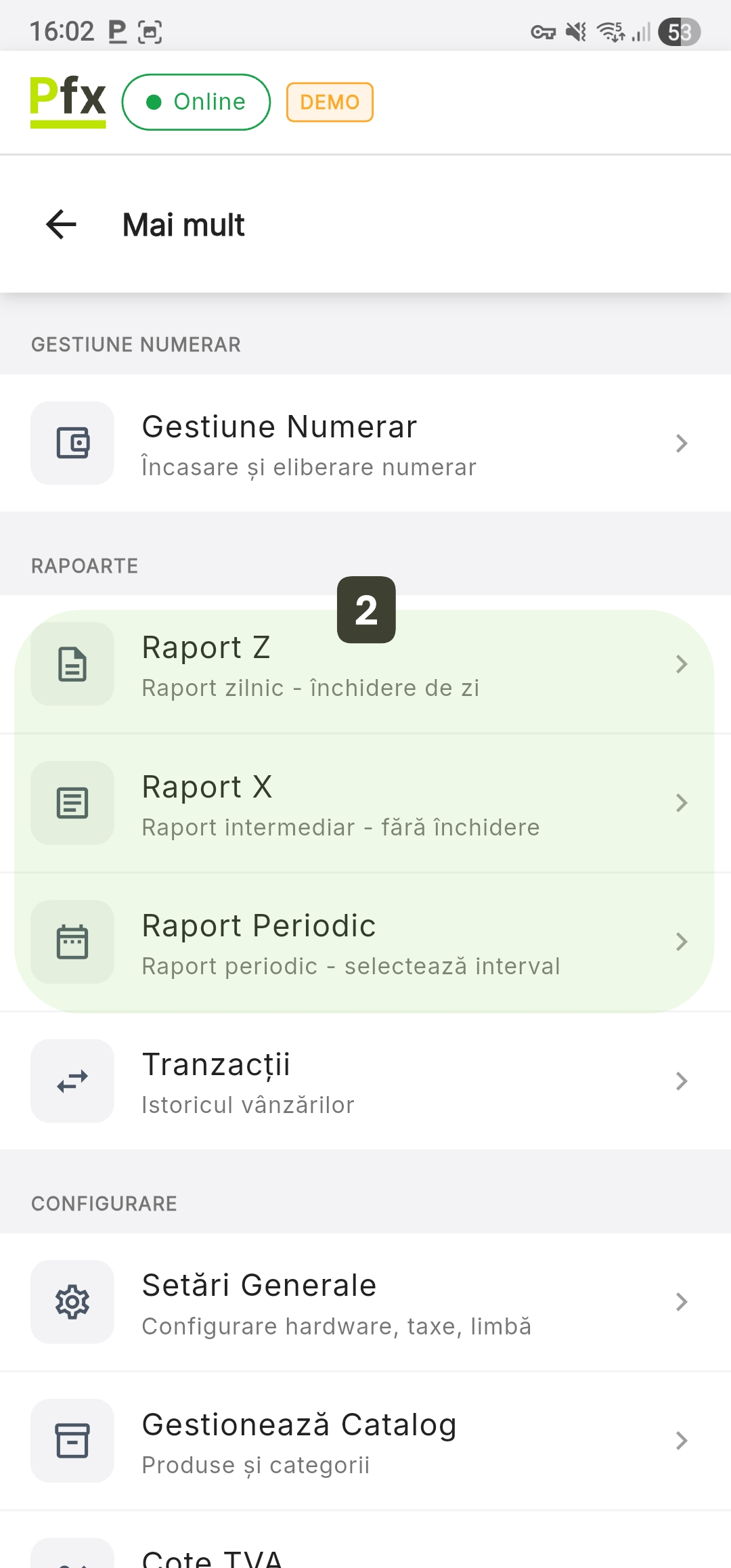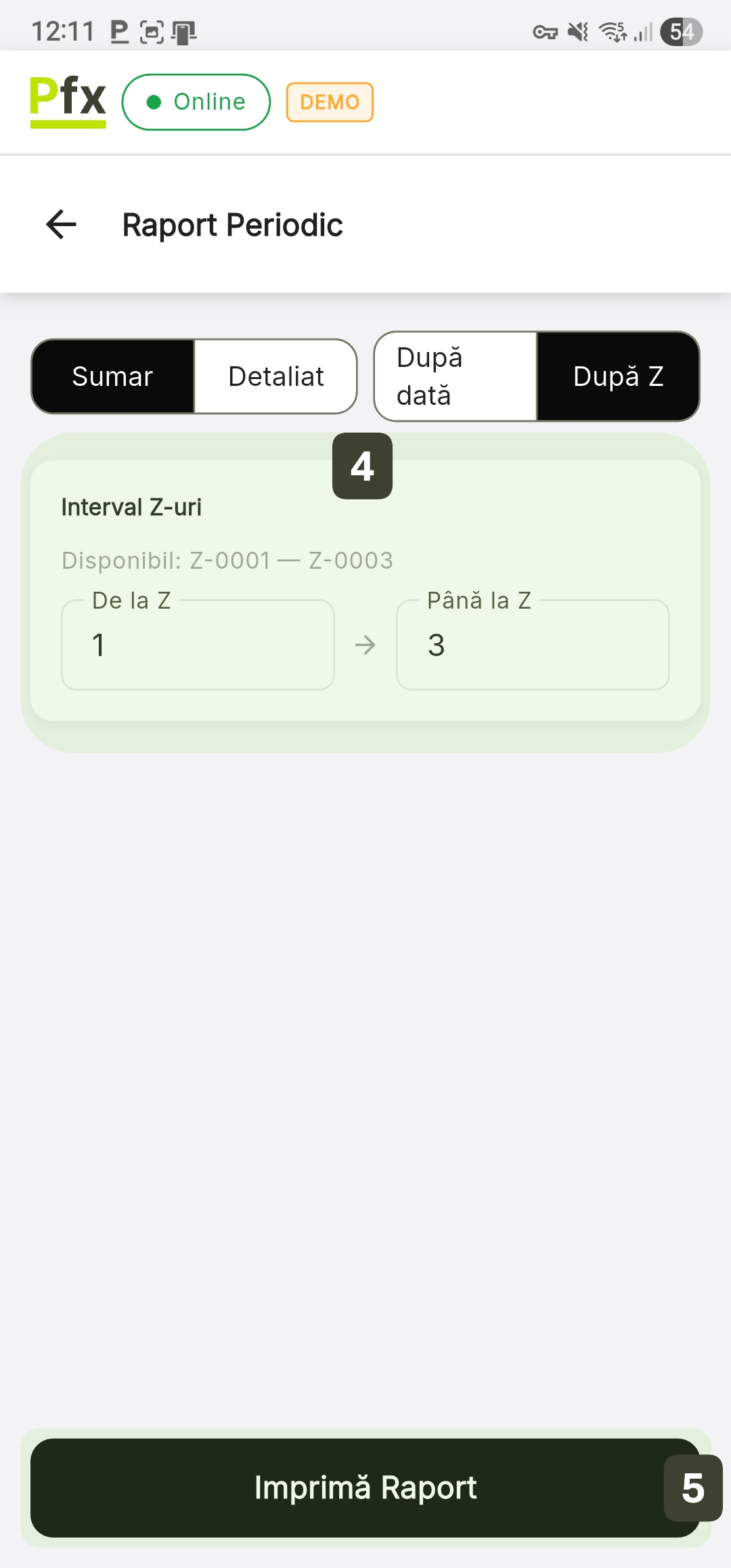 - Selectați tipul de raport dorit: Raport Z, Raport X sau Raport Periodic