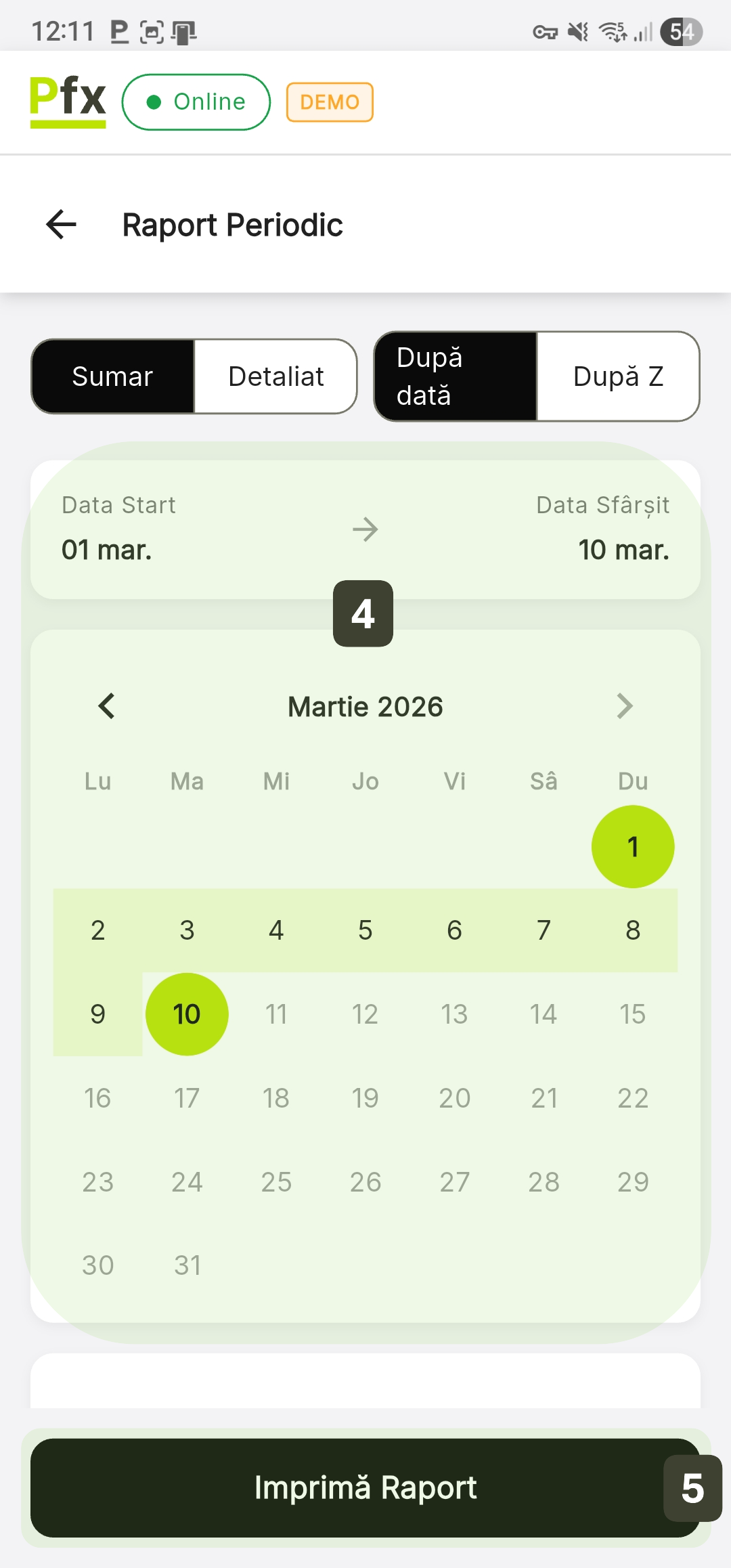 - Detaliat: Oferă o defalcare zilnică, prezentând totalurile fiscale pentru fiecare zi din intervalul ales.