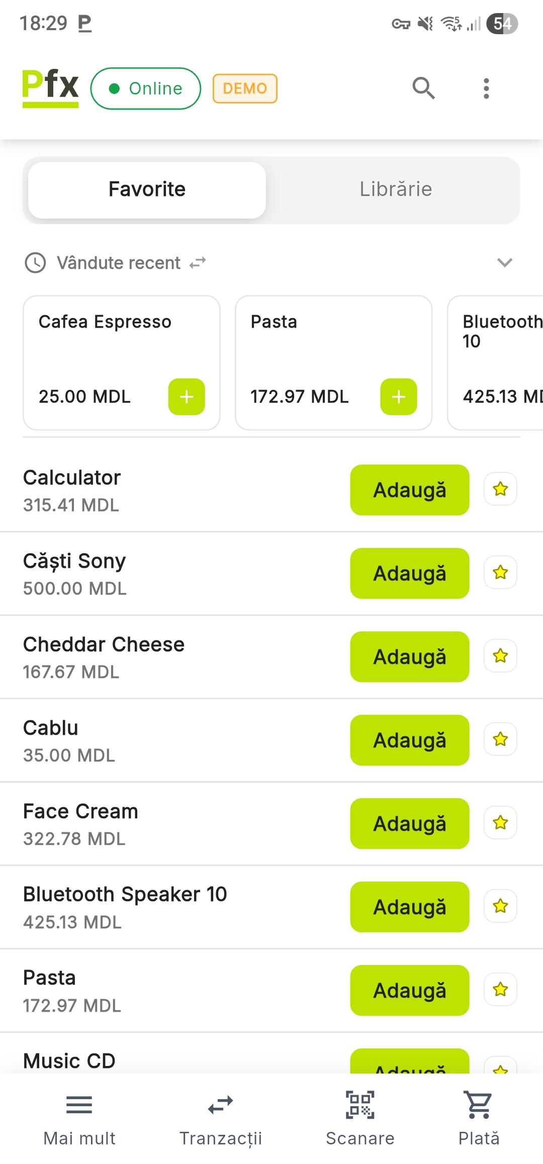 Sistemul PosFix permite adăugarea rapidă a produselor prin scanarea codurilor de bare, utilizând fie hardware-ul integrat al terminalului, fie periferice externe.