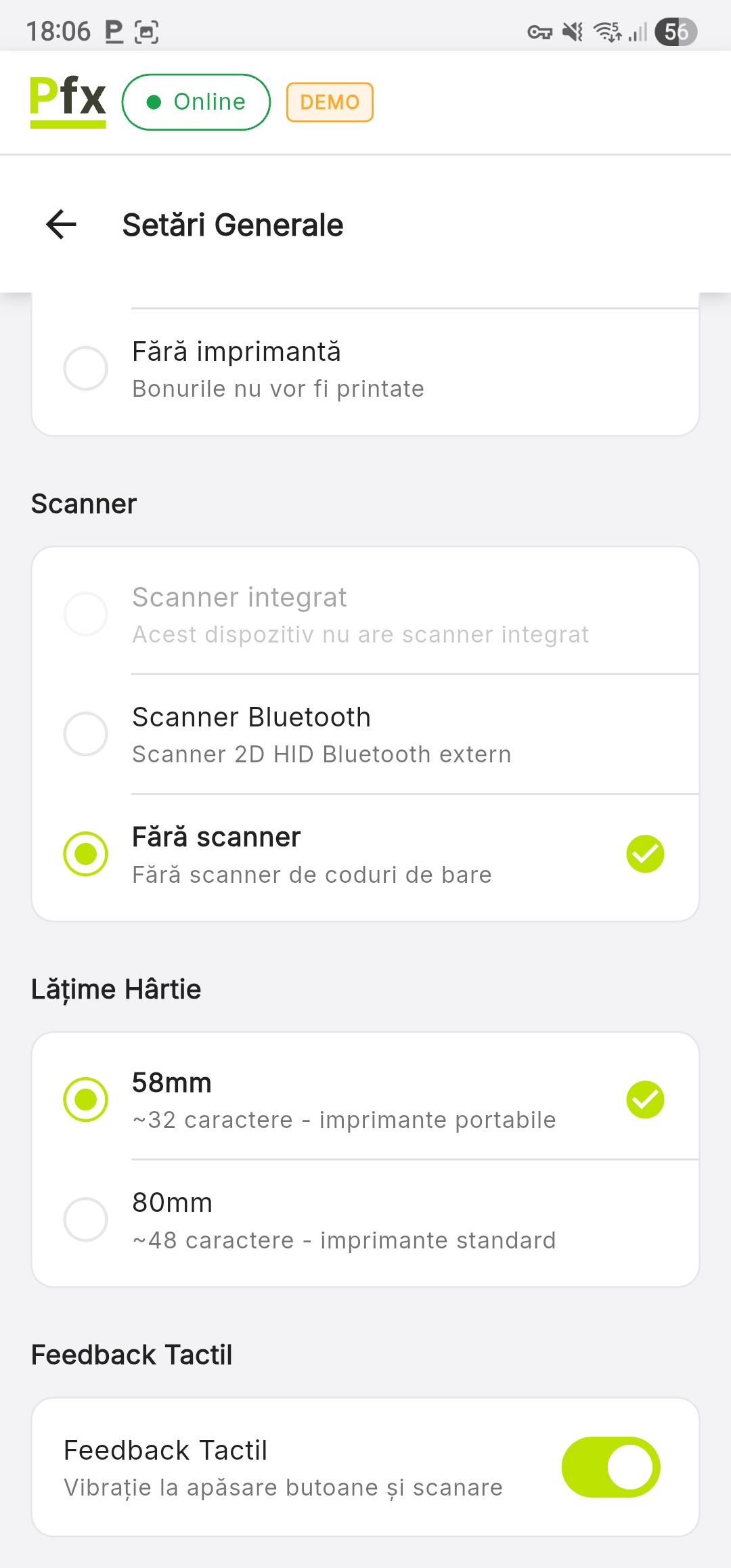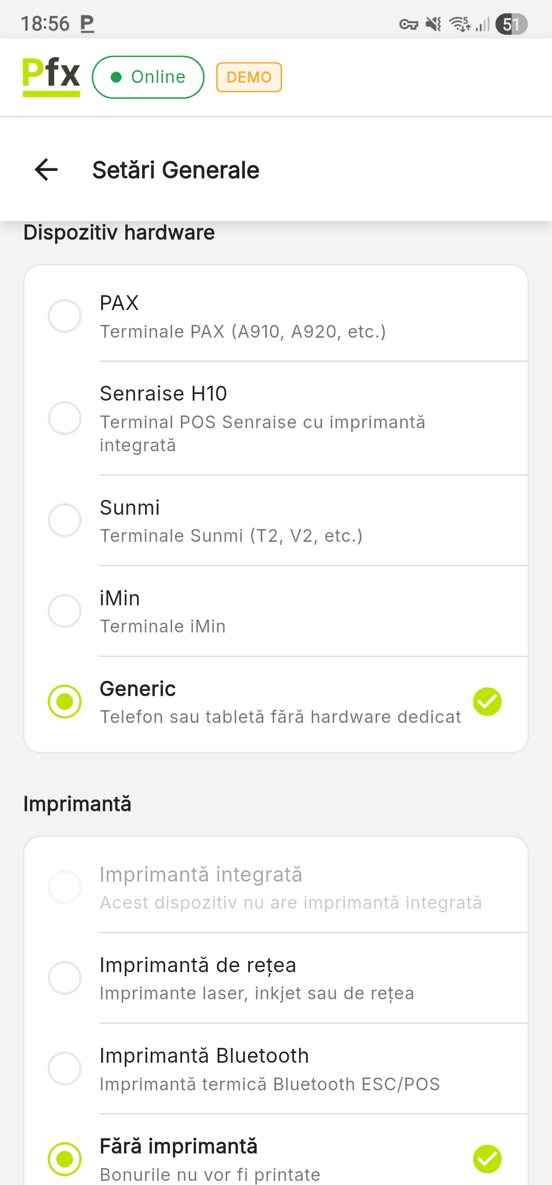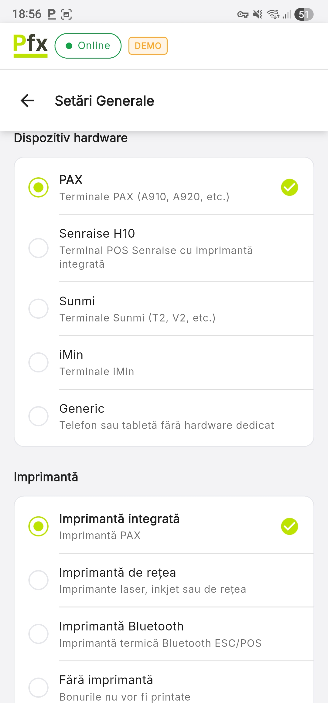 Selectați tipul de terminal POS pe care rulează aplicația. Această setare determină automat ce funcții hardware sunt disponibile (imprimantă built-in, scanner built-in).