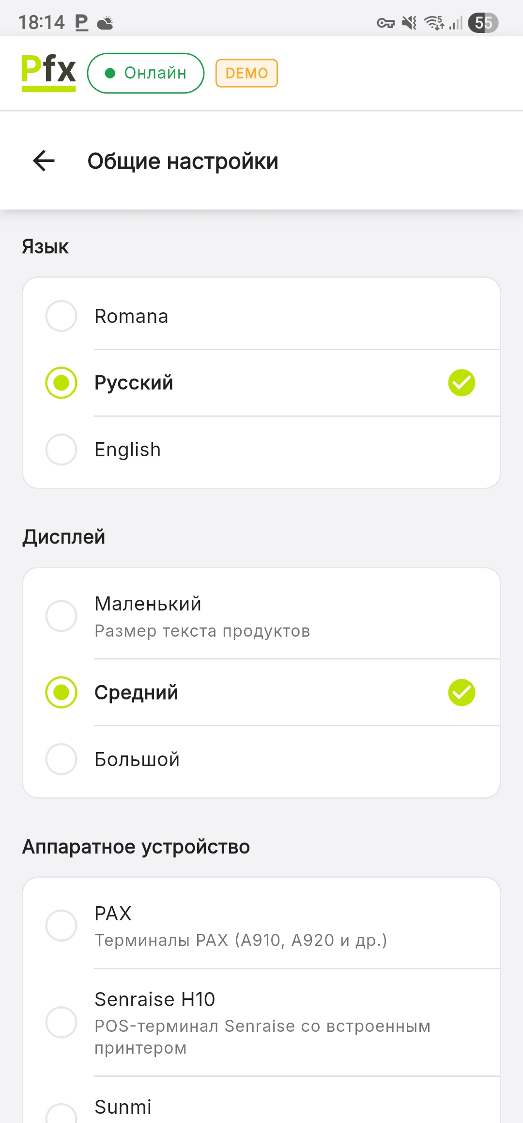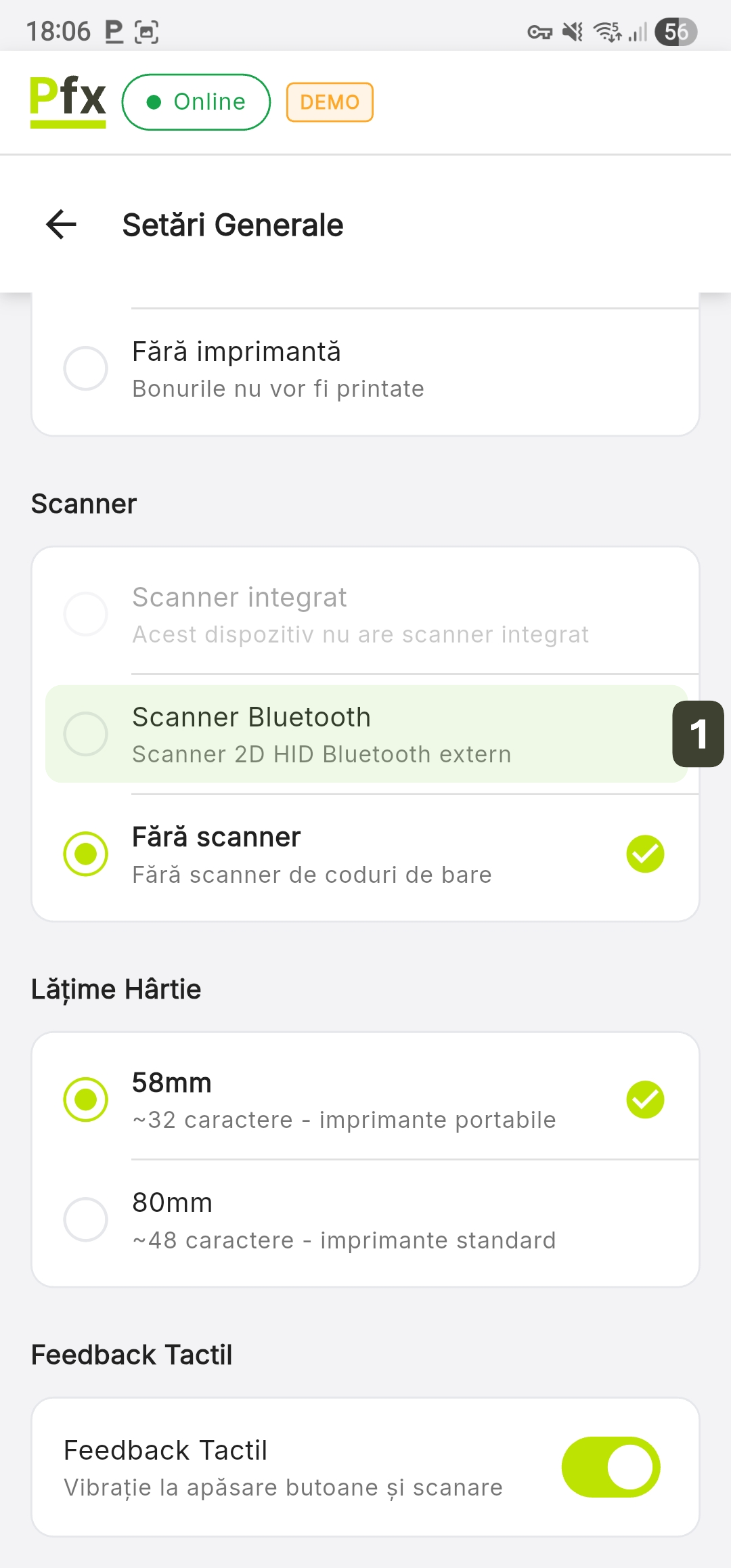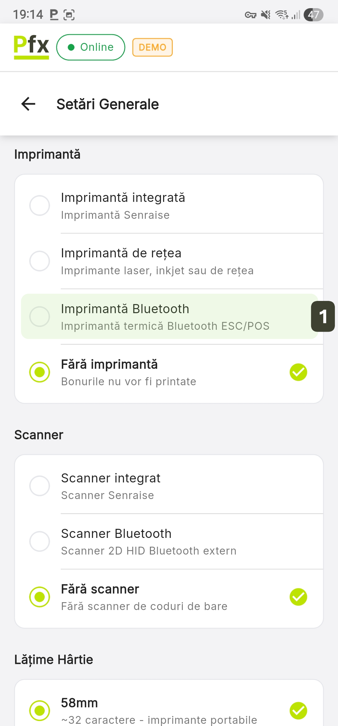 Selectați tipul de terminal POS pe care rulează aplicația. Această setare determină automat ce funcții hardware sunt disponibile (imprimantă built-in, scanner built-in).