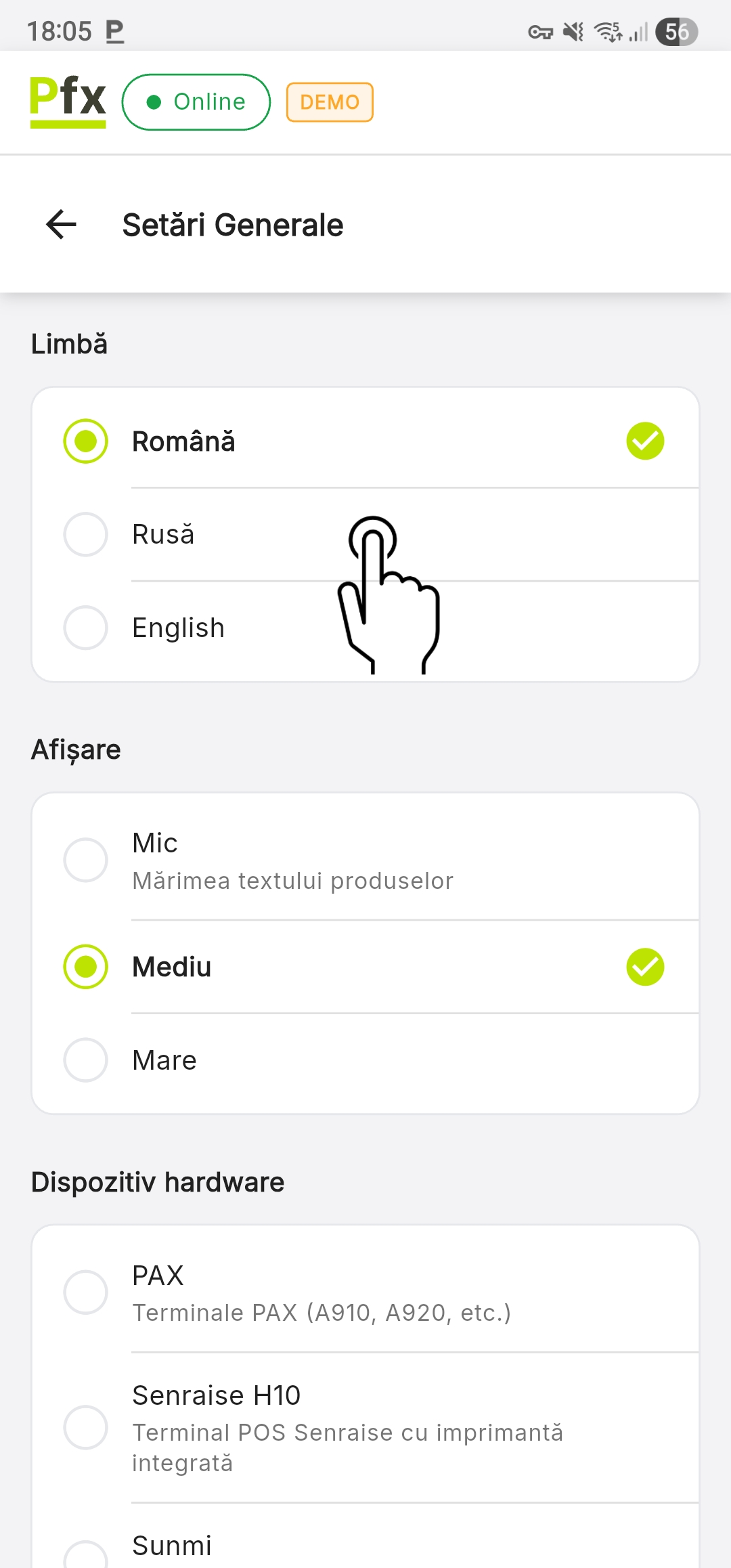 Din meniul Setări Generale apăsați pe limba dorită. Interfața aplicației se va traduce automat imediat după apăsarea noii opțiuni, fără a fi necesară repornirea terminalului.