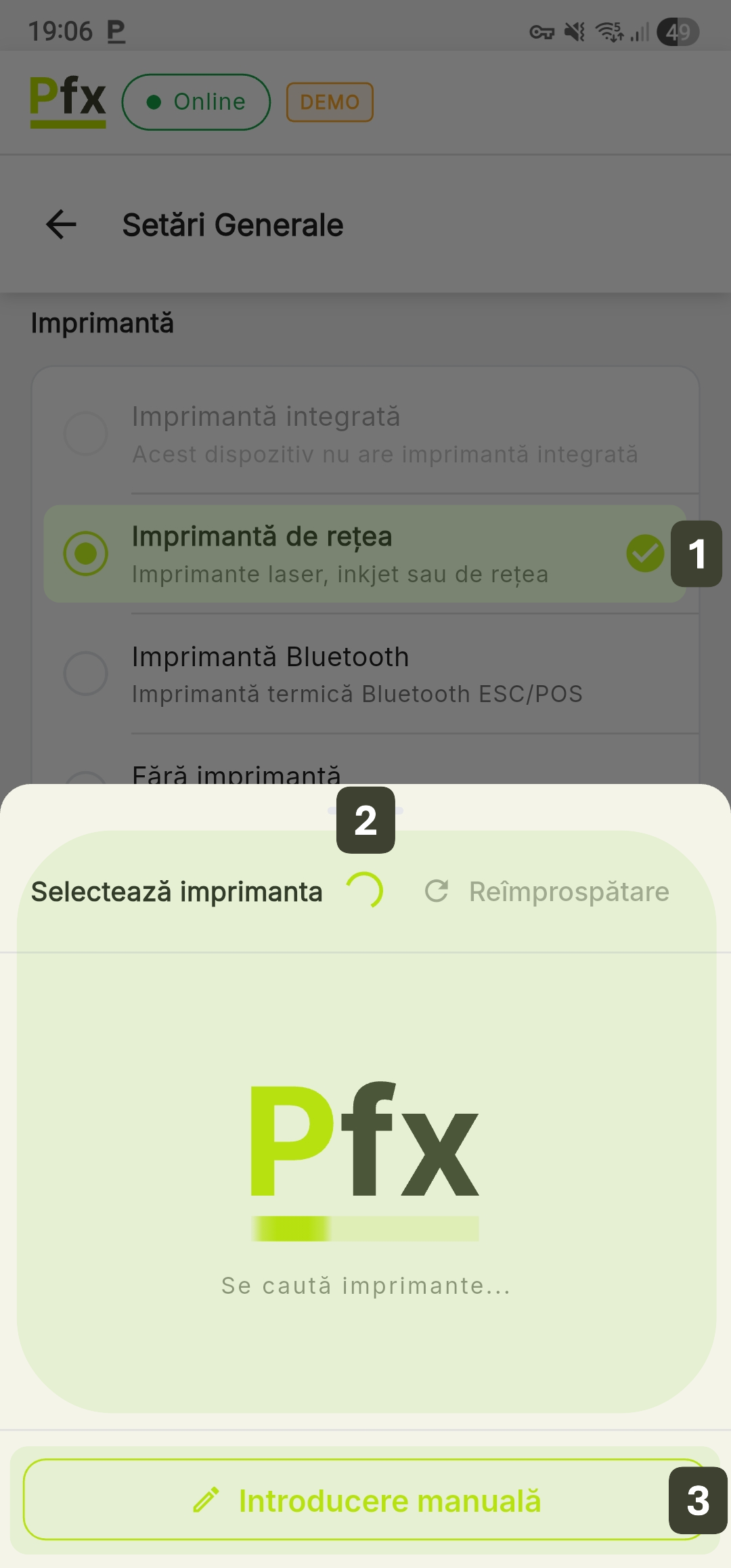 Așteptați ca aplicația să scaneze rețeaua. Dacă imprimanta este detectată, aceasta va apărea în listă cu denumirea sau adresa sa IP - Introducere Manuală: Dacă imprimanta nu este detectată automat: