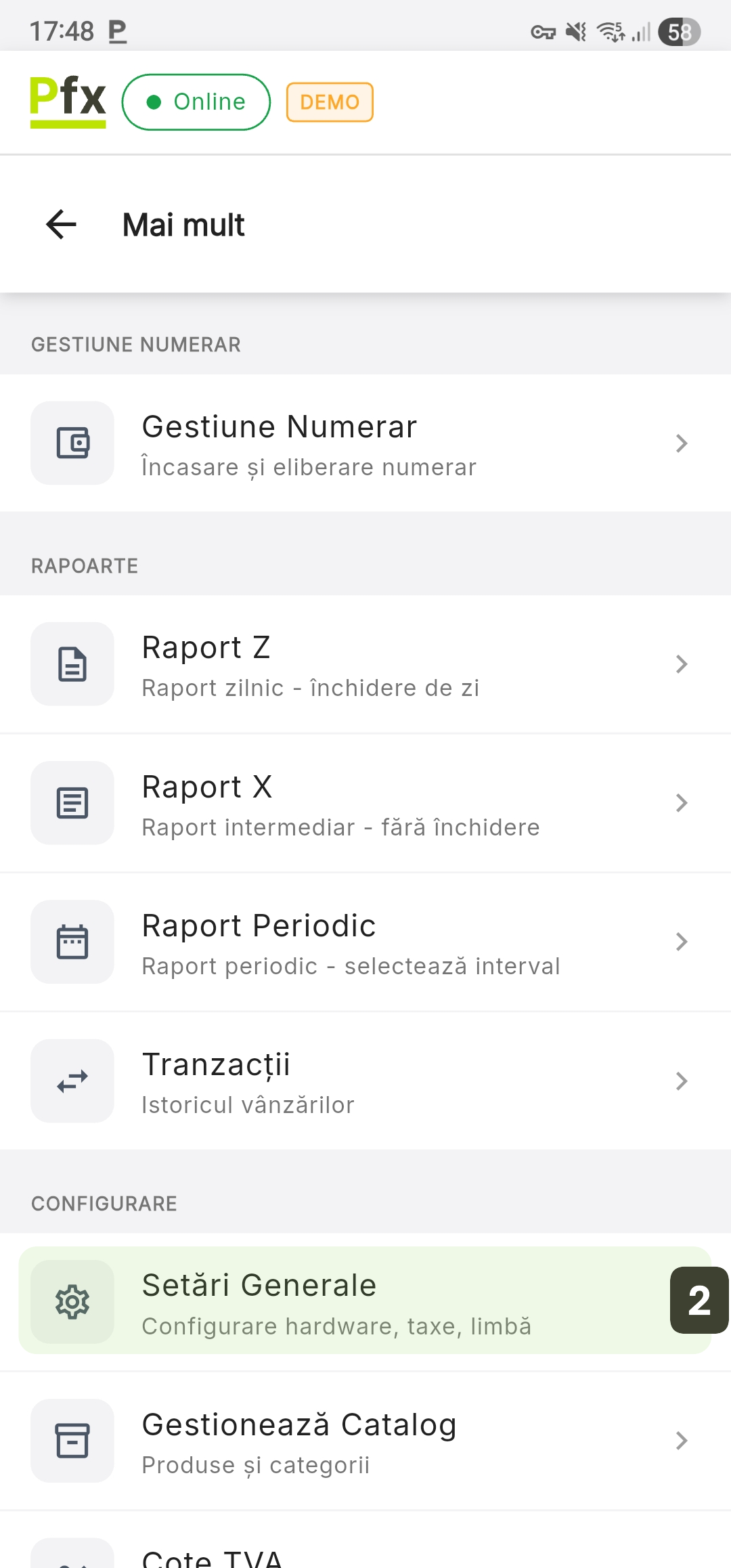 Meniul de setări este nucleul de configurare al terminalului, permițând adaptarea comportamentului aplicației PosFix la cerințele specifice ale punctului dumneavoastră de vânzare.
