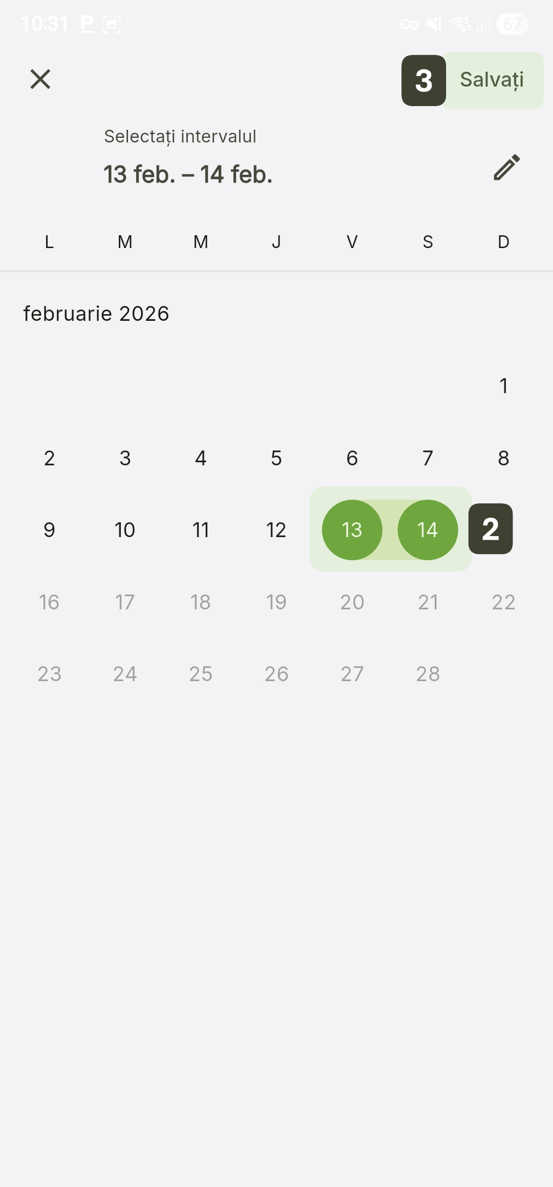 Sistemul va evidenția zilele selectate și perioada cuprinsă între acestea. - Apăsați butonul Salvați