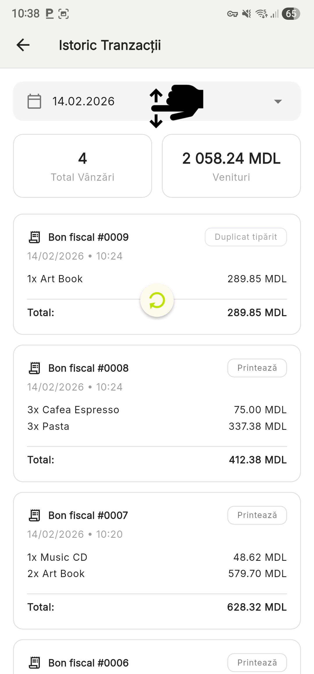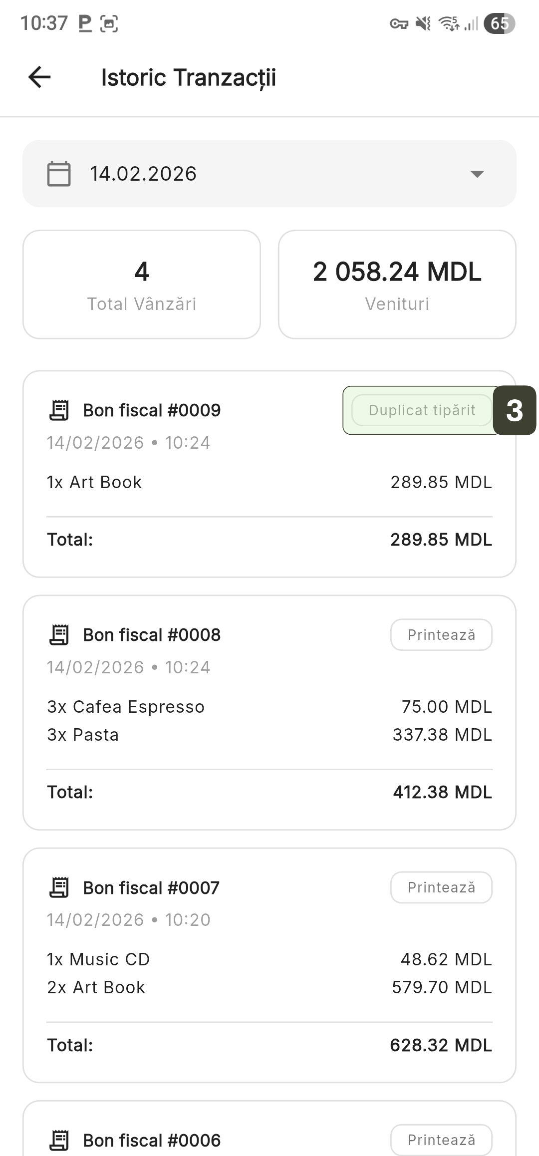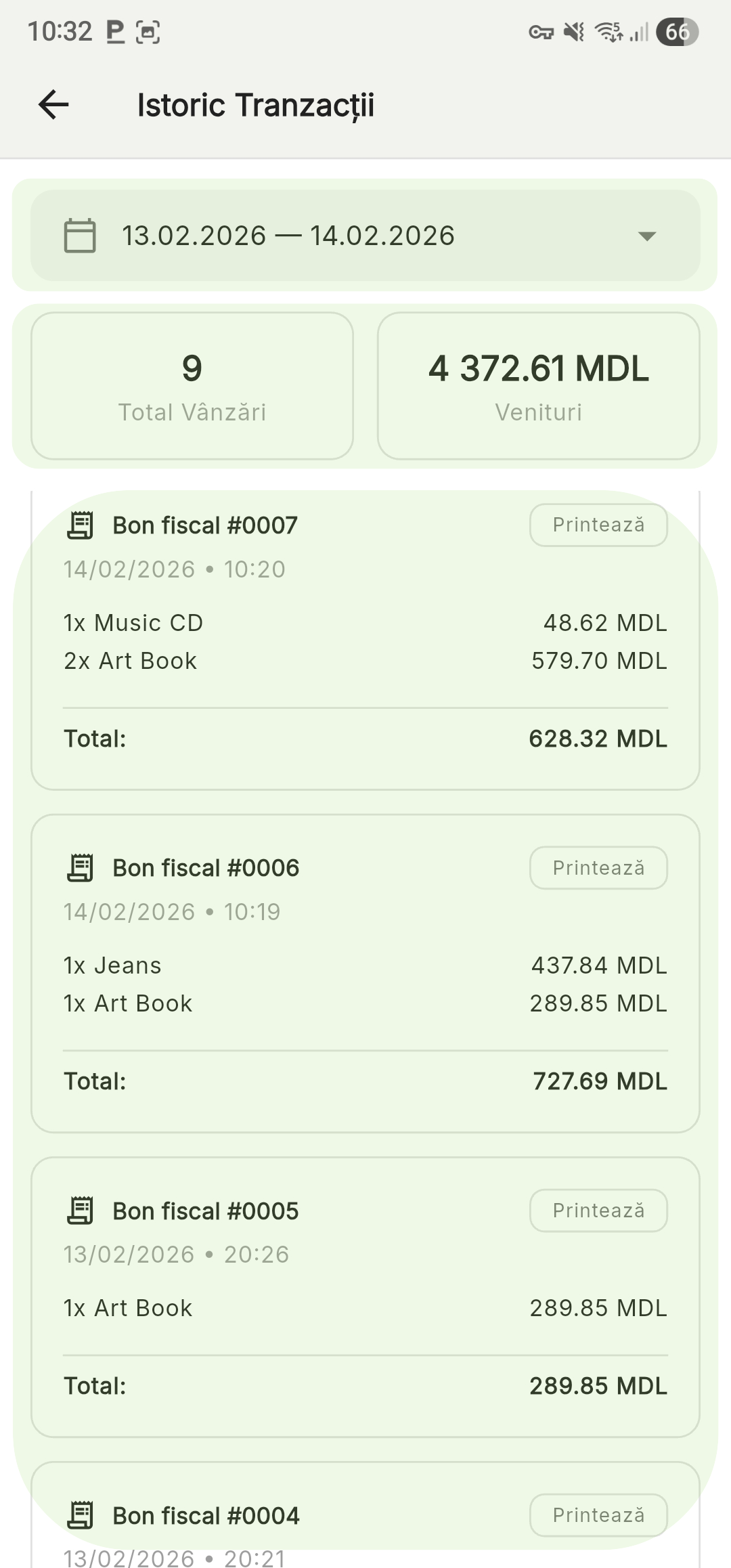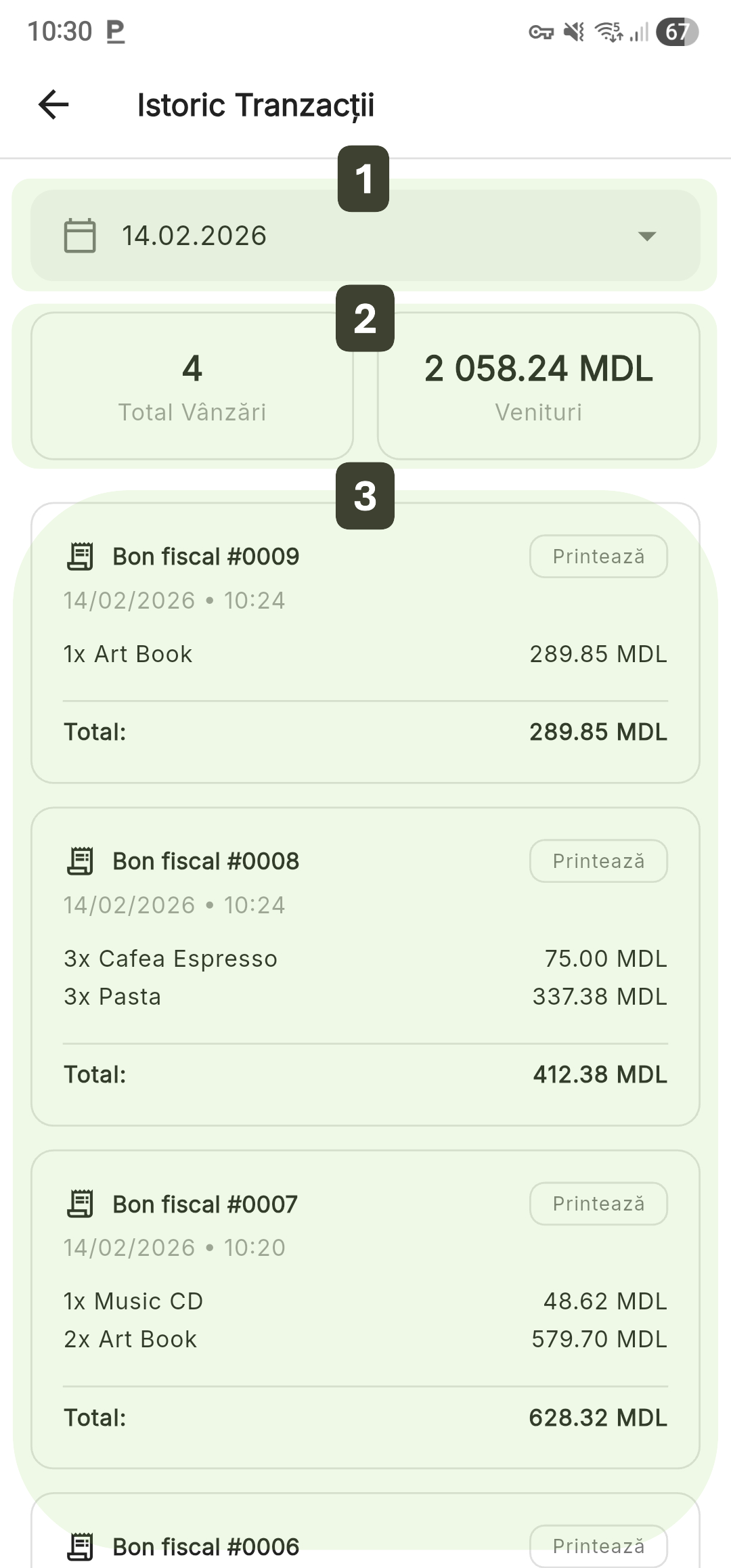 Această secțiune funcționează ca o arhivă digitală a tuturor tranzacțiilor efectuate prin terminal. Aici puteți vizualiza bonuri anterioare, verifica sumele încasate și retipări duplicate.