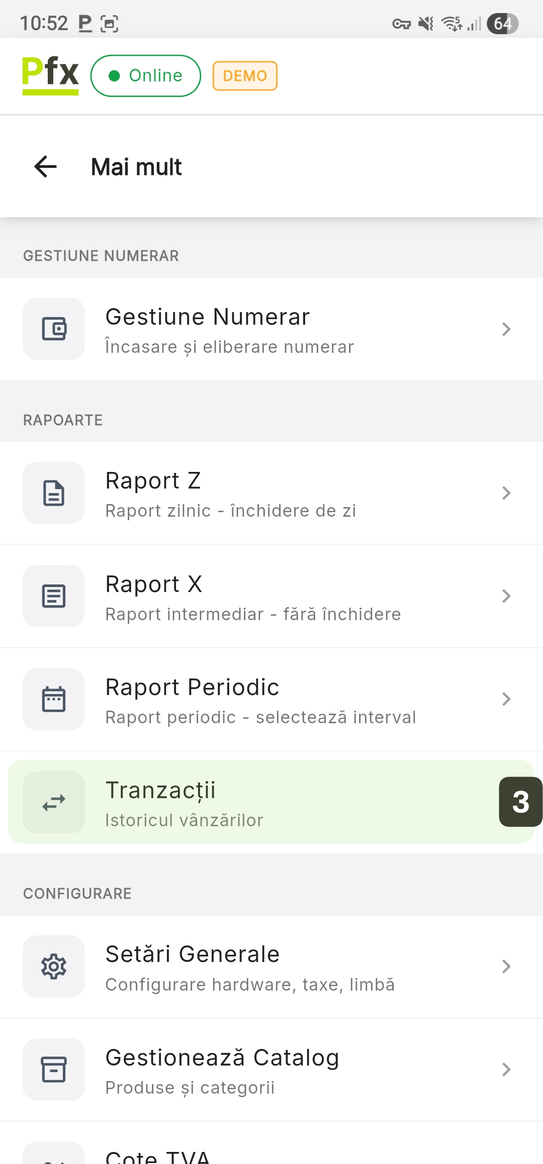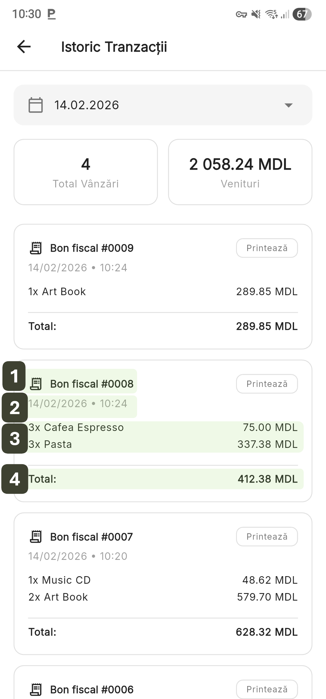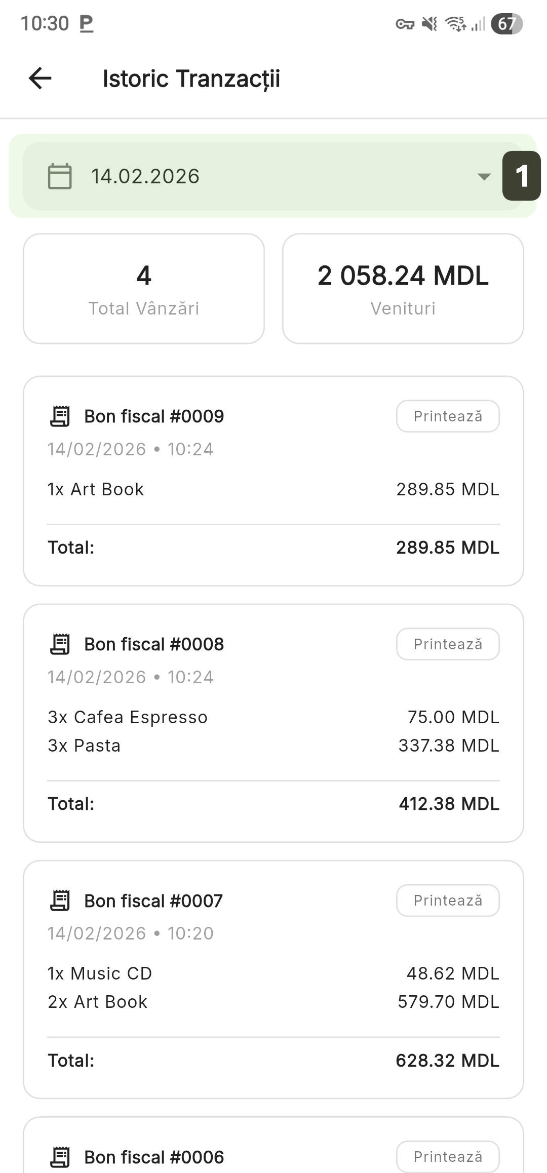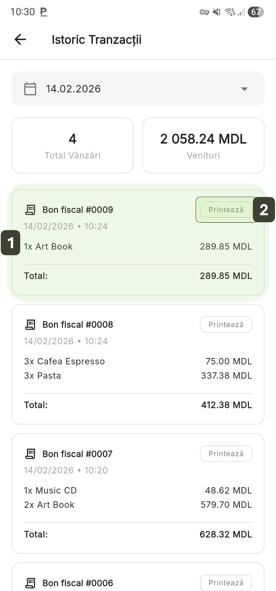 Această secțiune funcționează ca o arhivă digitală a tuturor tranzacțiilor efectuate prin terminal. Aici puteți vizualiza bonuri anterioare, verifica sumele încasate și retipări duplicate.