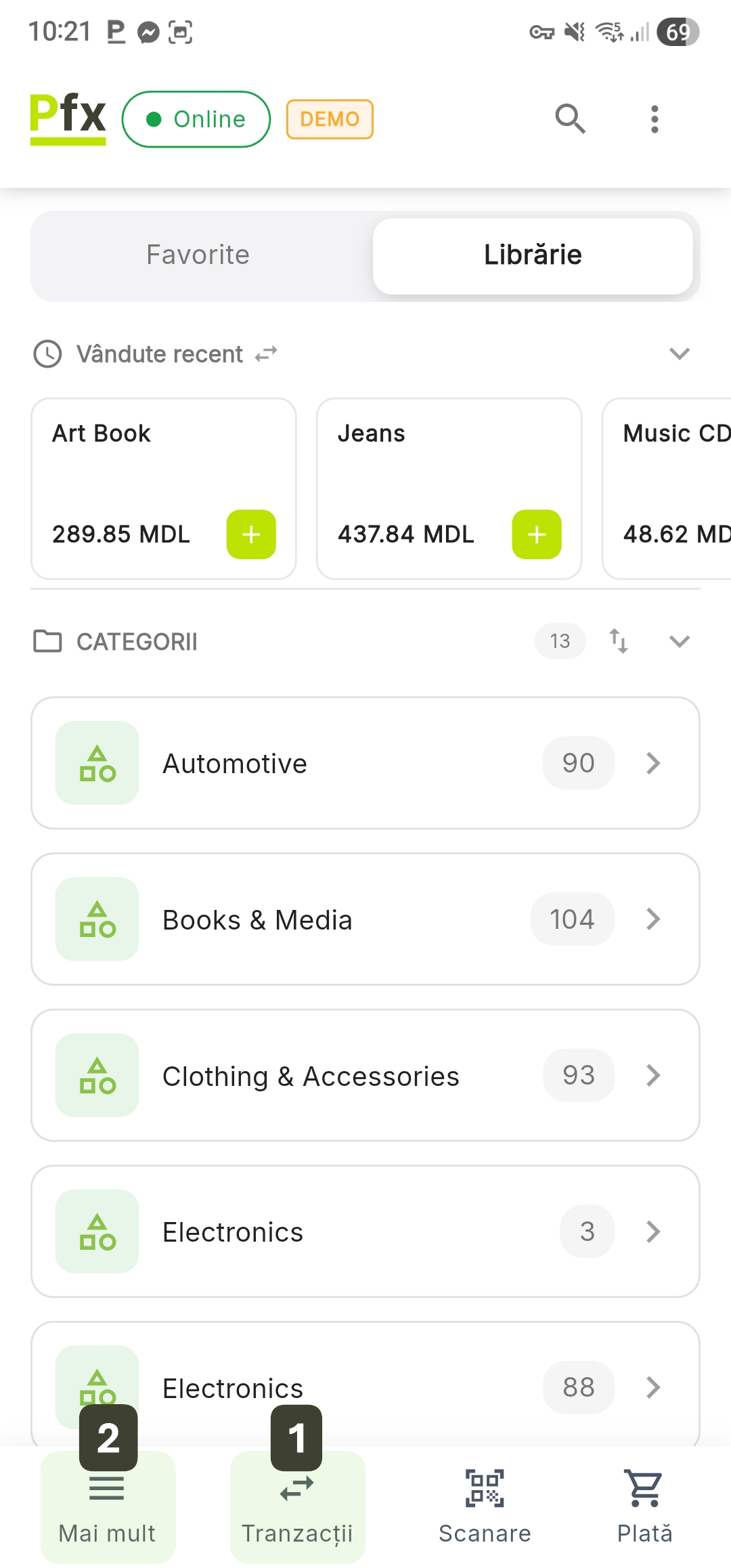 Tranzacțiile din ziua curentă sunt afișate primele, iar pentru a vedea vânzările din zilele anterioare trebuie să glisați (scroll) în josul listei sau să modificați filtrul perioadei.