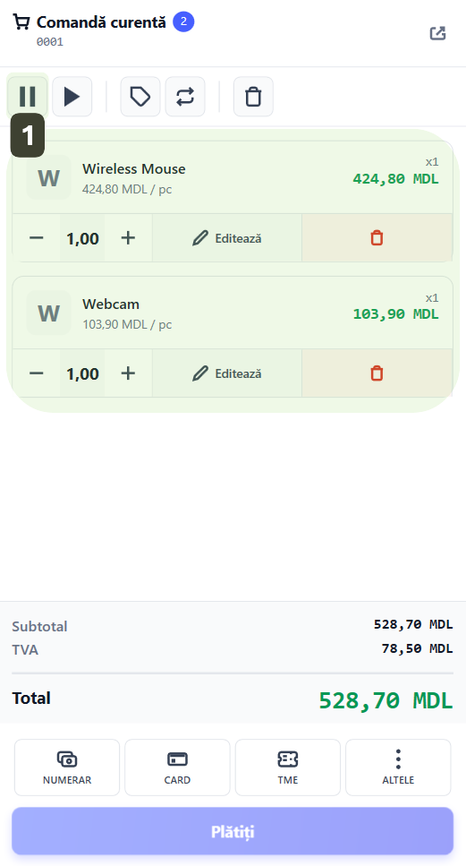 - Acțiune: Casierul apasă butonul Suspendare. Coșul se golește, iar casierul poate servi imediat clientul următor care așteaptă la rând.