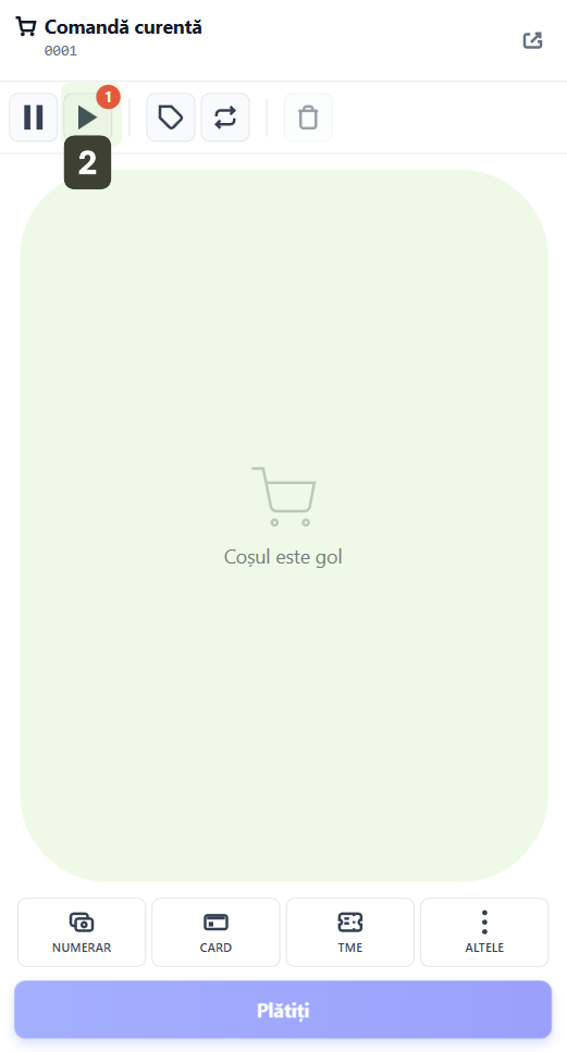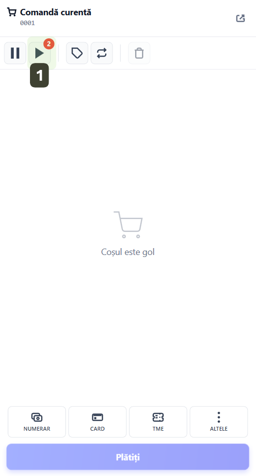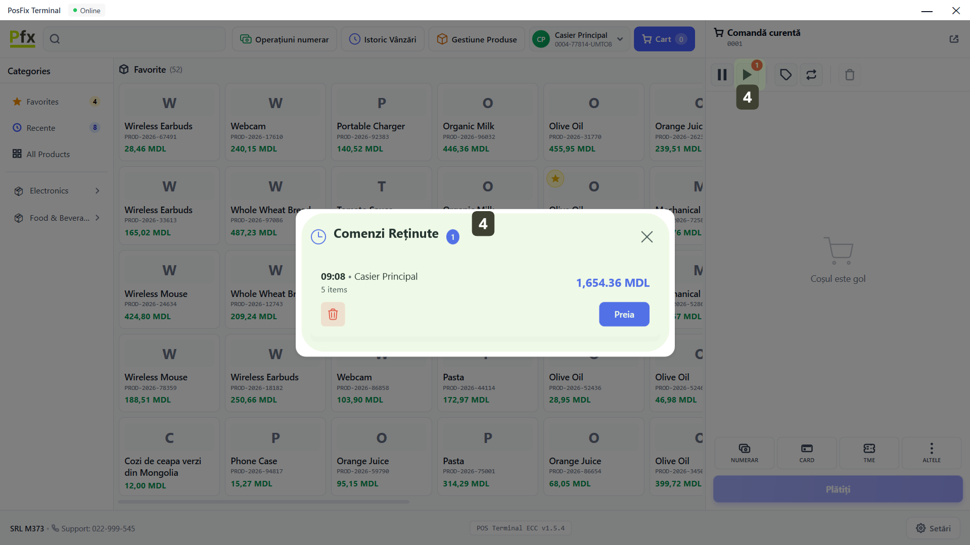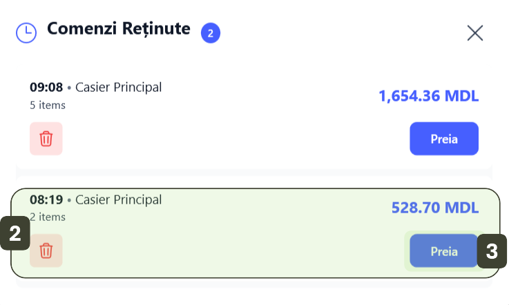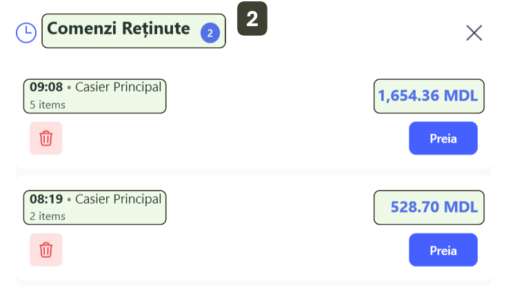 Această funcție vă permite să accesați lista clienților puși în așteptare și să readuceți produsele lor în coș pentru finalizarea plății.