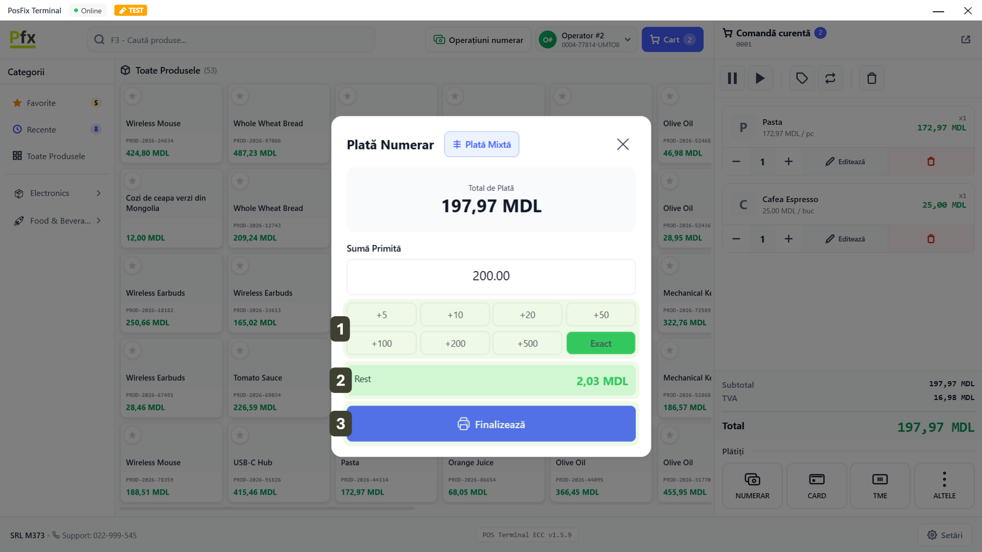 Dacă clientul oferă suma fixă (fără rest), apăsați direct butonul Exact (suma se completează automat).