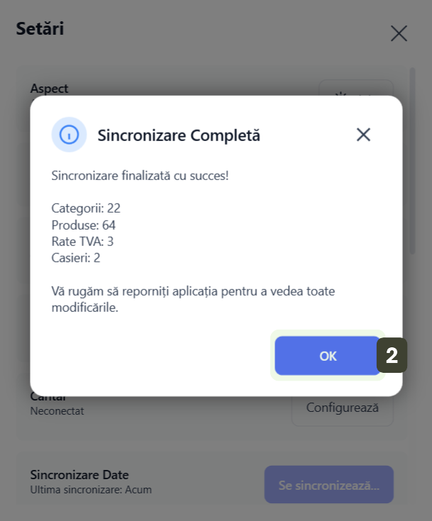 Dacă ați făcut o modificare urgentă în sistemul central (ex: ați schimbat un preț greșit) și nu doriți să așteptați ciclul automat, puteți forța actualizarea imediată. Pentru a forța sincronizarea, accesați opțiunea din Setări:
