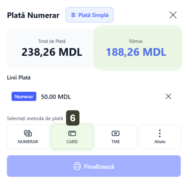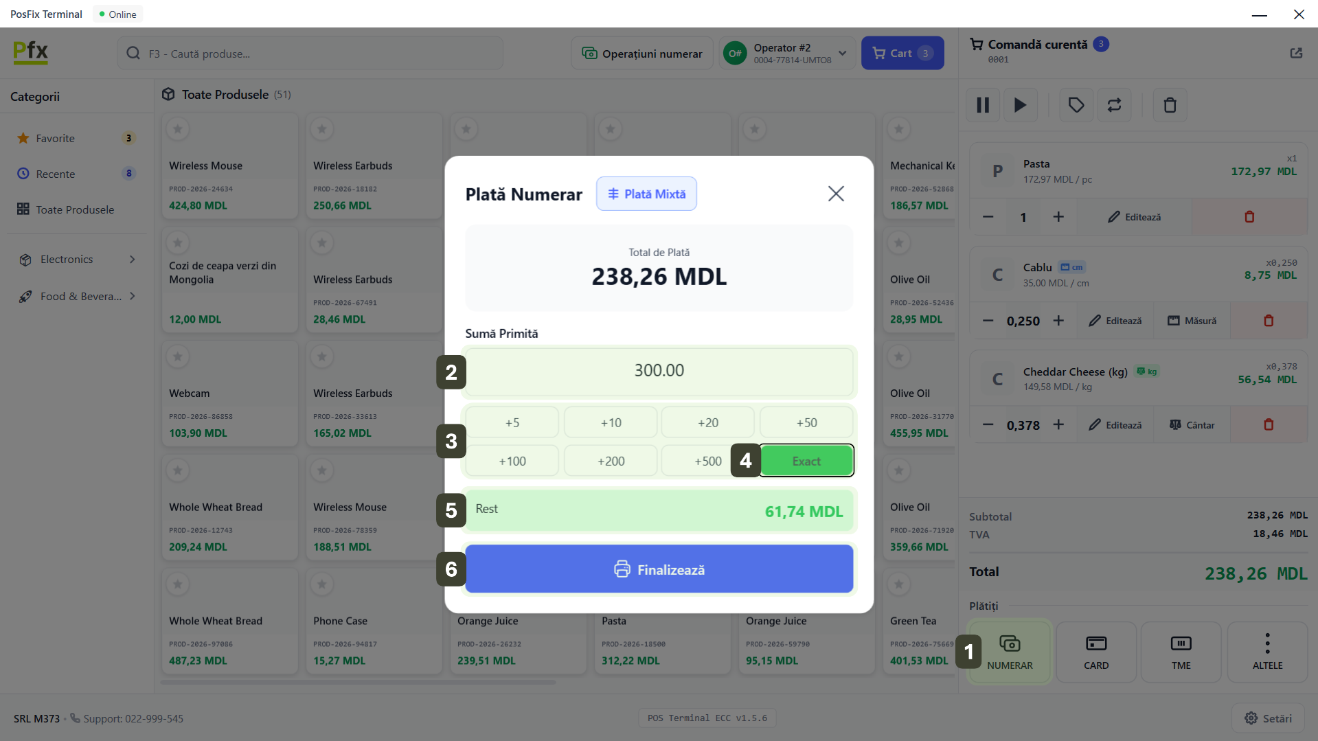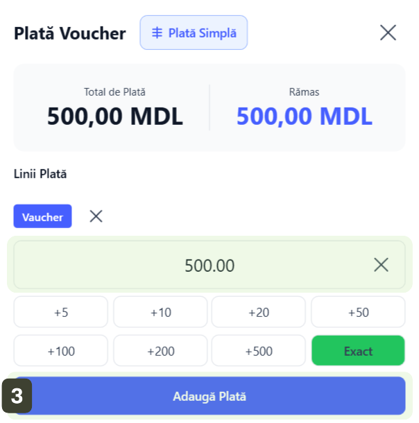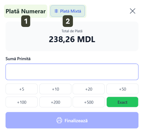 - Alternativ, apăsați butonul Exact dacă clientul a oferit suma fixă (rest 0.00 MDL)