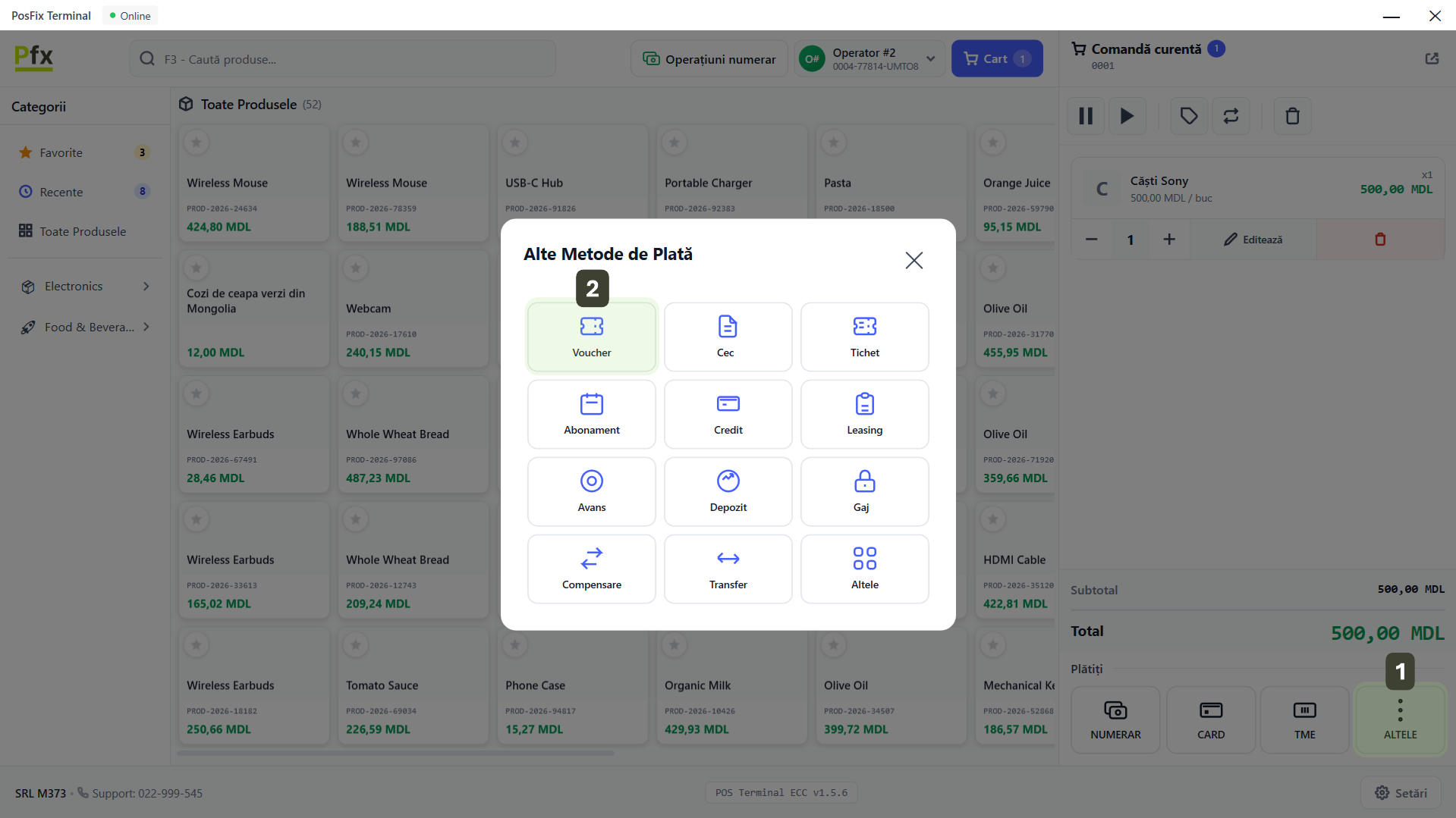 Plata în numerar este cea mai frecventă operațiune la casa de marcat. Interfața PosFix este optimizată pentru a procesa aceste tranzacții cu viteză maximă, oferind operatorului instrumente ajutătoare pentru introducerea rapidă a sumelor (prin butoane presetate) și calcularea automată a restului, eliminând astfel erorile umane.