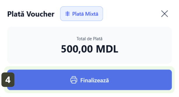 Dacă valoarea voucherului este mai mică decât totalul de plată, sistemul va afișa automat diferența rămasă ca Rămas. Va trebui să selectați o a doua metodă (ex: Numerar sau Card) pentru a încasa diferența și a închide bonul.