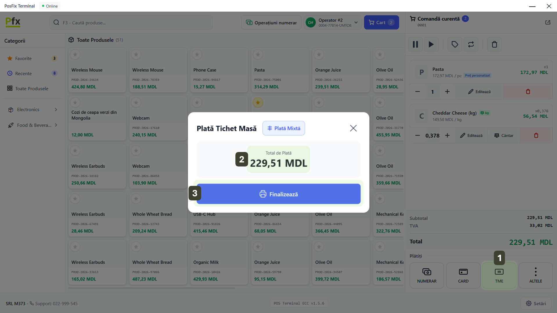 Sistemul PosFix suportă multiple metode de plată. Această secțiune ghidează operatorul prin procesul de transformare a coșului de produse într-o tranzacție finalizată, explicând modul de utilizare a zonei de plăți. Veți regăsi instrucțiuni clare pentru gestionarea diverselor instrumente financiare acceptate (numerar, card bancar, tichete de masă sau metode mixte), precum și funcțiile automate ale sistemului, cum ar fi calculul restului și emiterea bonului fiscal.