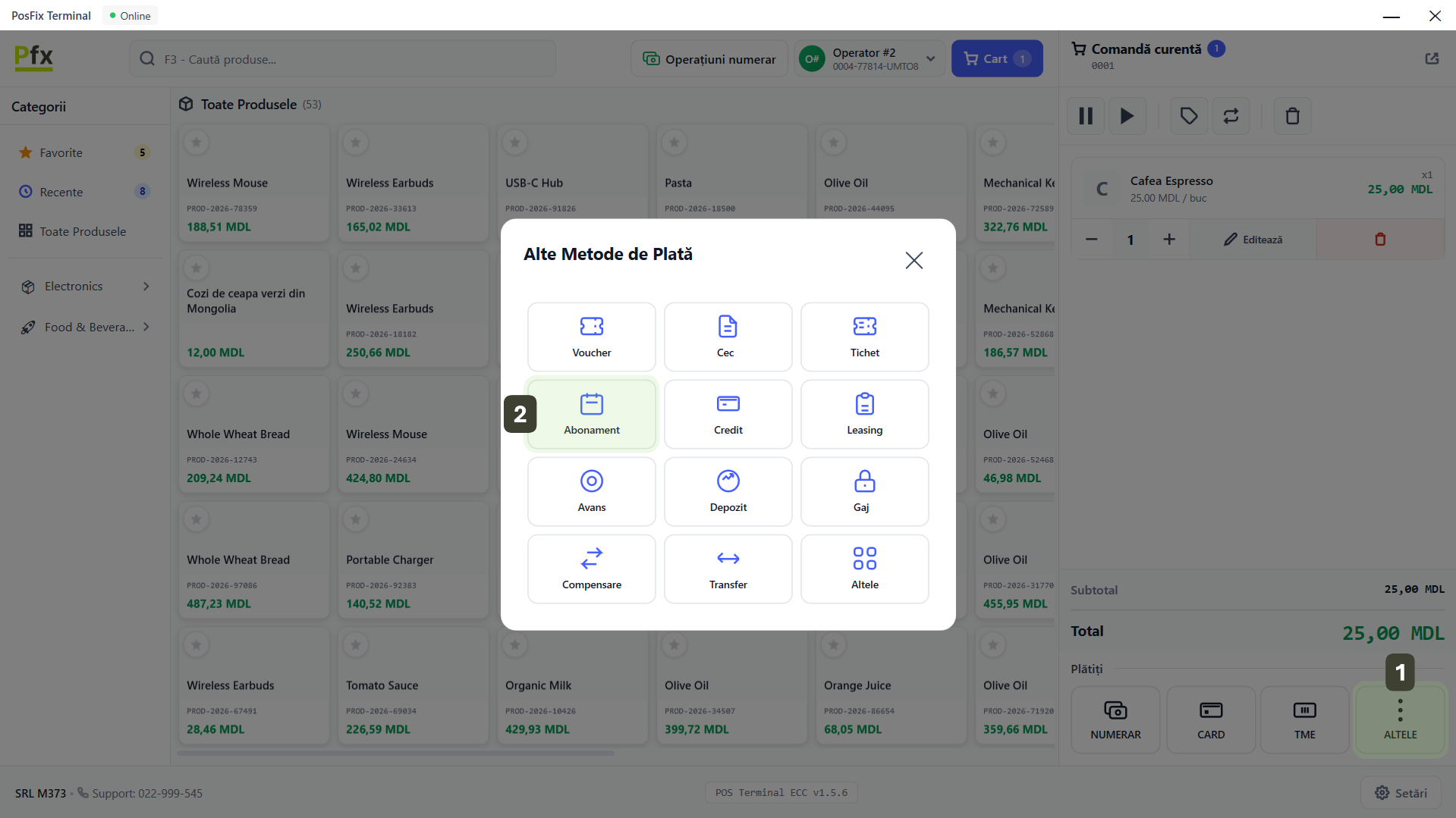 Această metodă este utilizată pentru clienții fideli care dețin un abonament activ. Utilizați această opțiune pentru a scădea contravaloarea produselor dintr-un abonament existent al clientului, fără a încasa numerar la momentul vânzării.