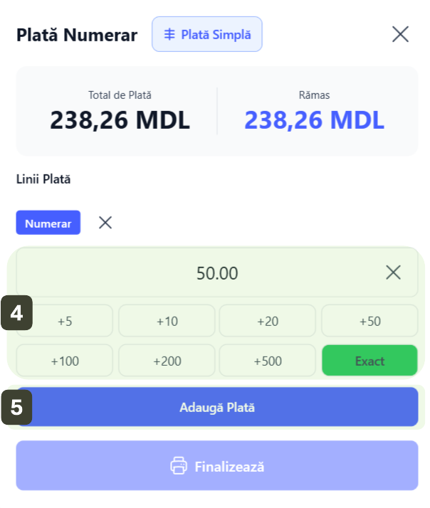 - Pentru rapiditate, puteți folosi butoanele presetate (+5, +10, +20, +50, +100, +200, +500 MDL) pentru a compune suma primită