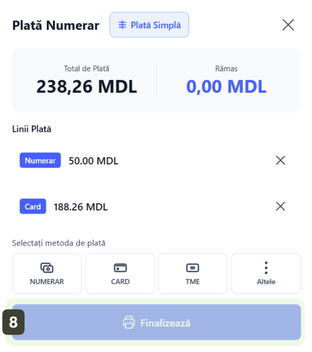 Dacă la ultima metodă de plată (ex: Numerar) clientul oferă o bancnotă mai mare decât diferența rămasă, sistemul va calcula restul în mod normal pentru acea tranșă.