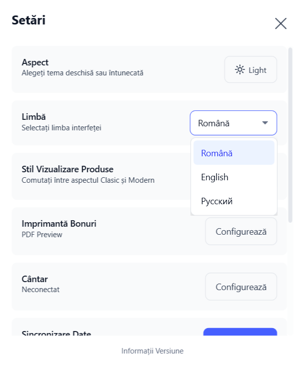Meniul Setări reprezintă centrul de configurare al aplicației. Acesta permite operatorilor și managerilor să adapteze comportamentul aplicației la nevoile specifice ale punctului de vânzare, fără a necesita intervenția echipei tehnice pentru modificările uzuale.