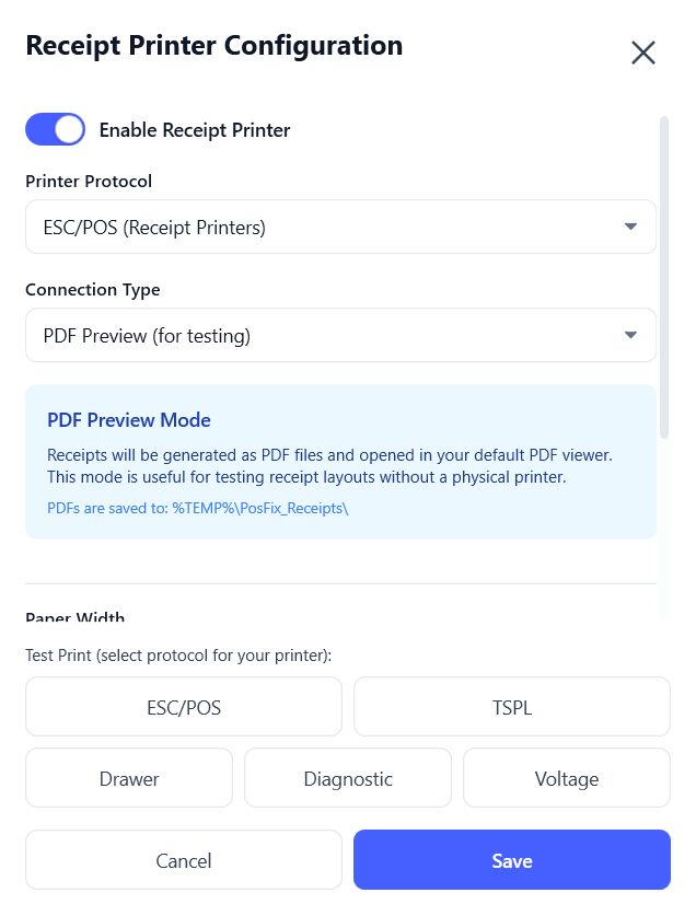- Drawer - Testează doar deschiderea sertarului de bani (fără a tipări)