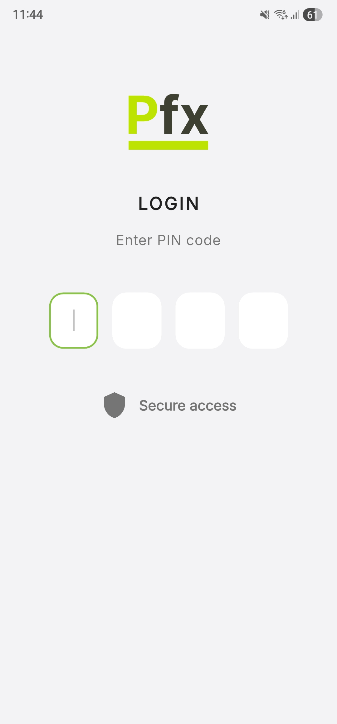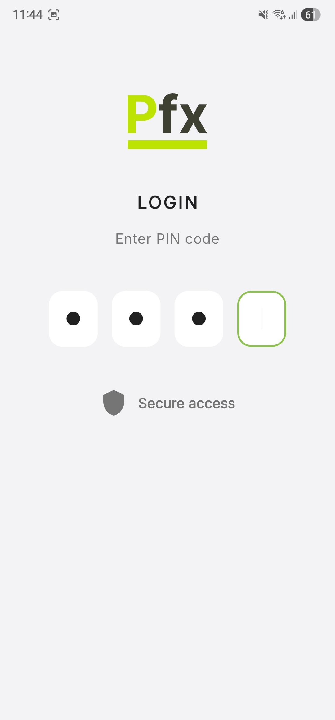 After terminal activation, each time the application starts you will see the authentication screen. Access is granted by entering your personal PIN code.