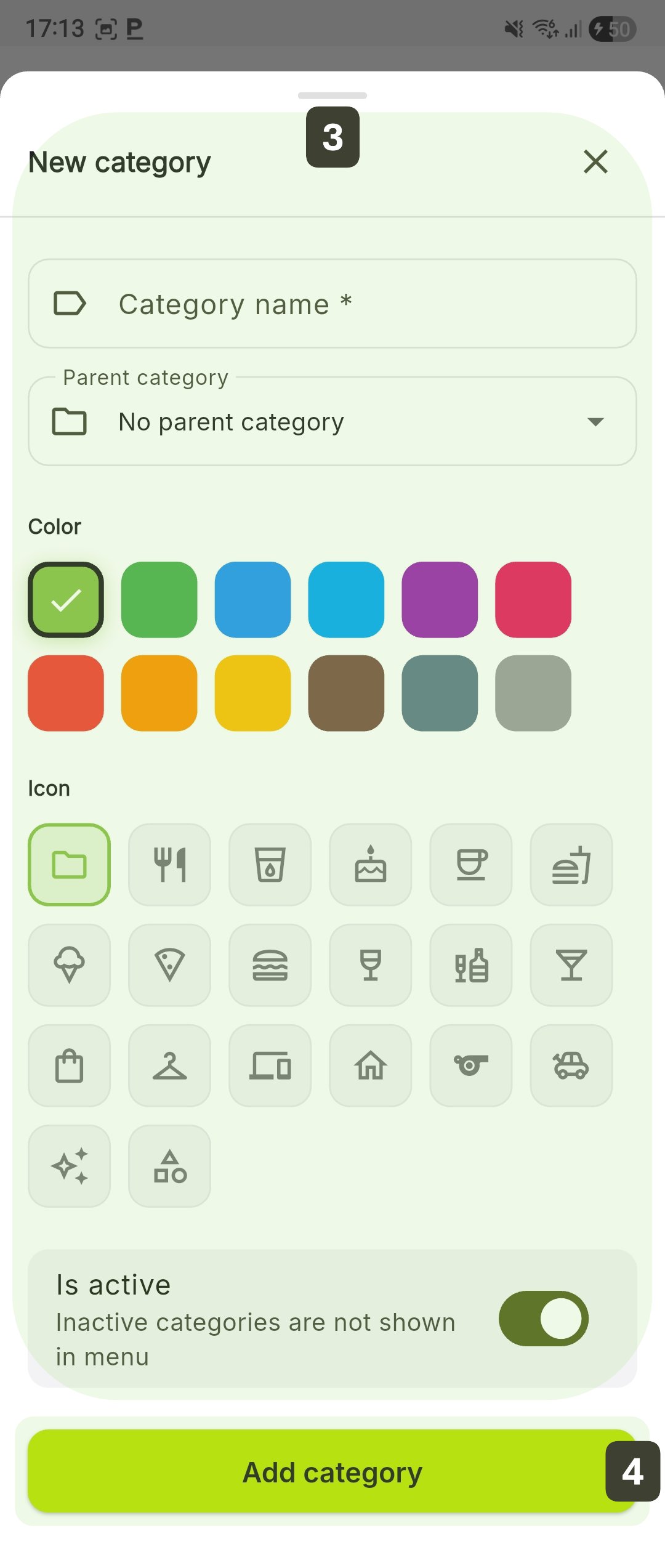 | Parent category | Leave the field as "No parent category" for a main category or select an existing category to create a subcategory |