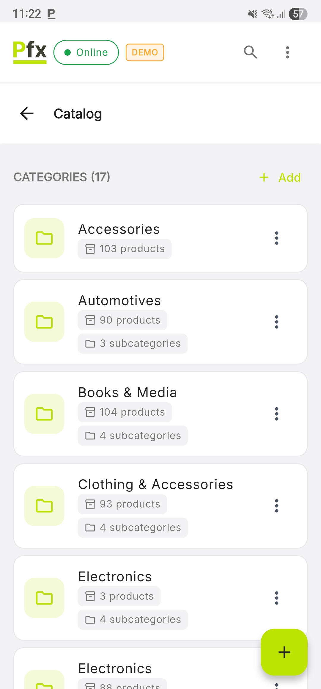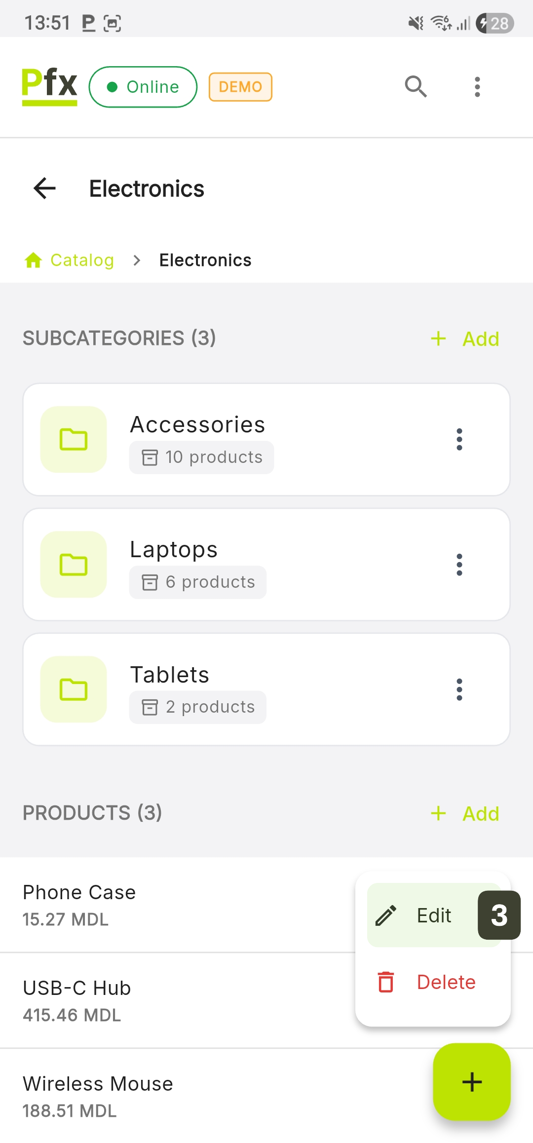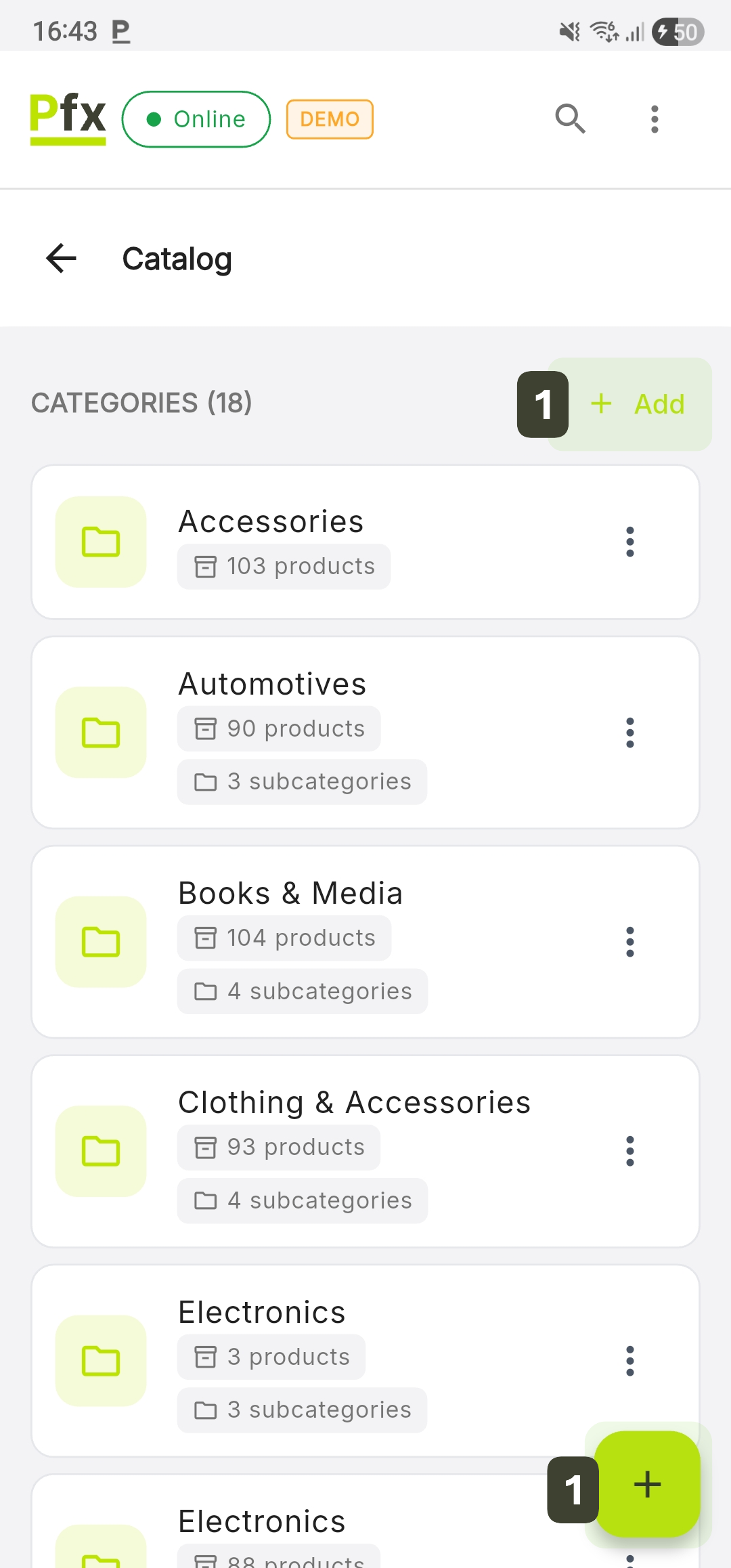 | Add button | Create new categories and products |