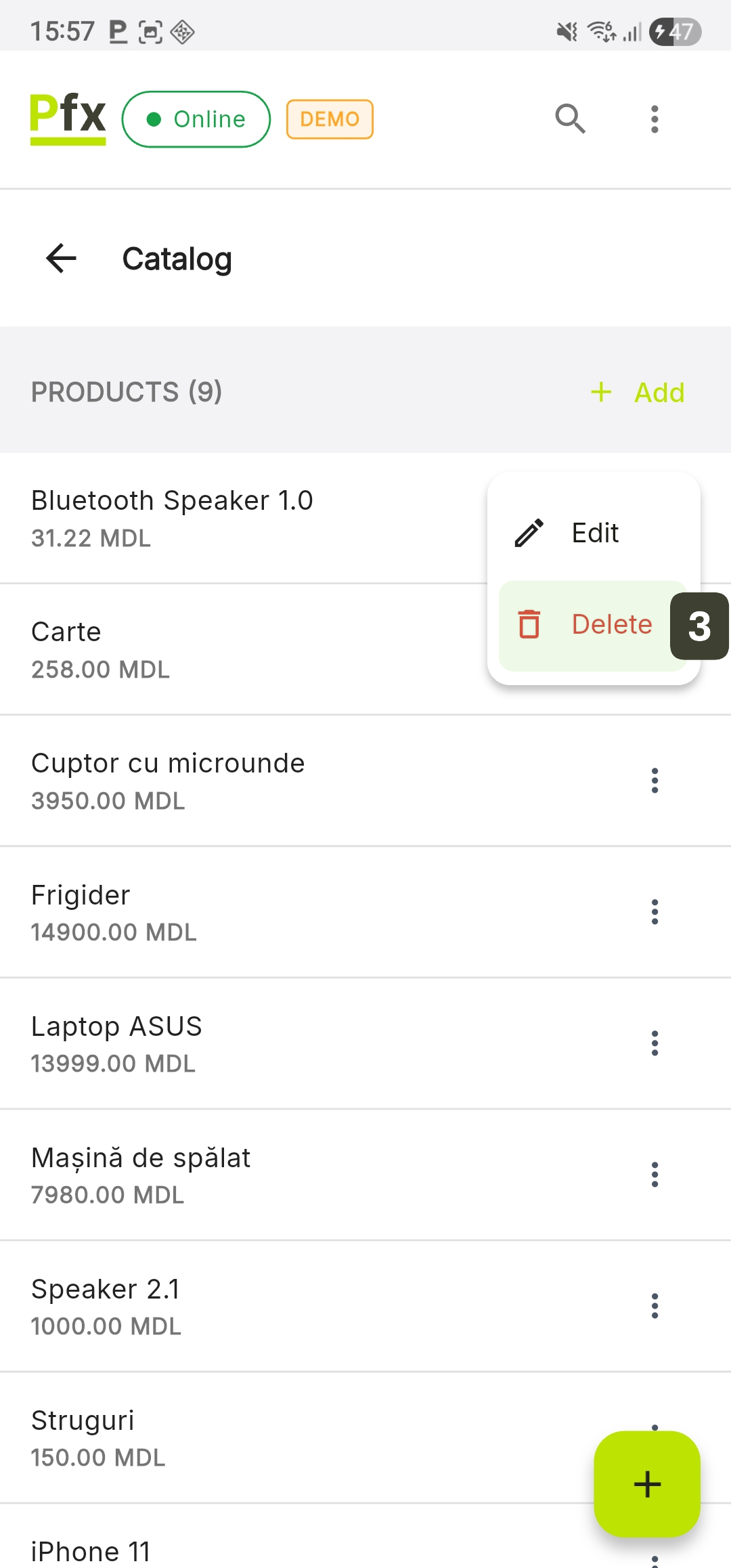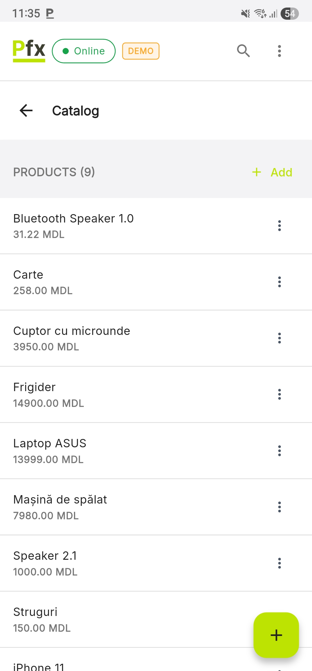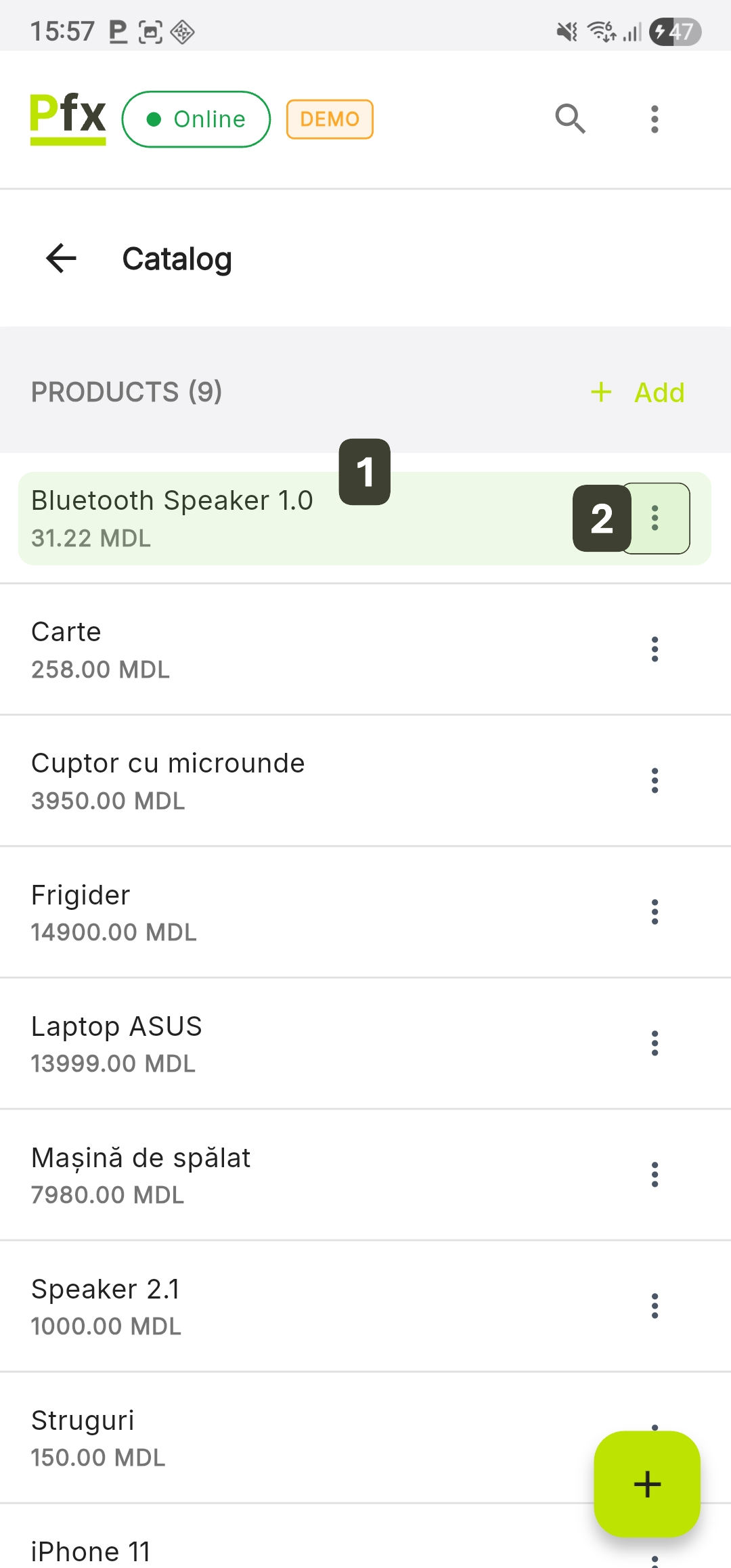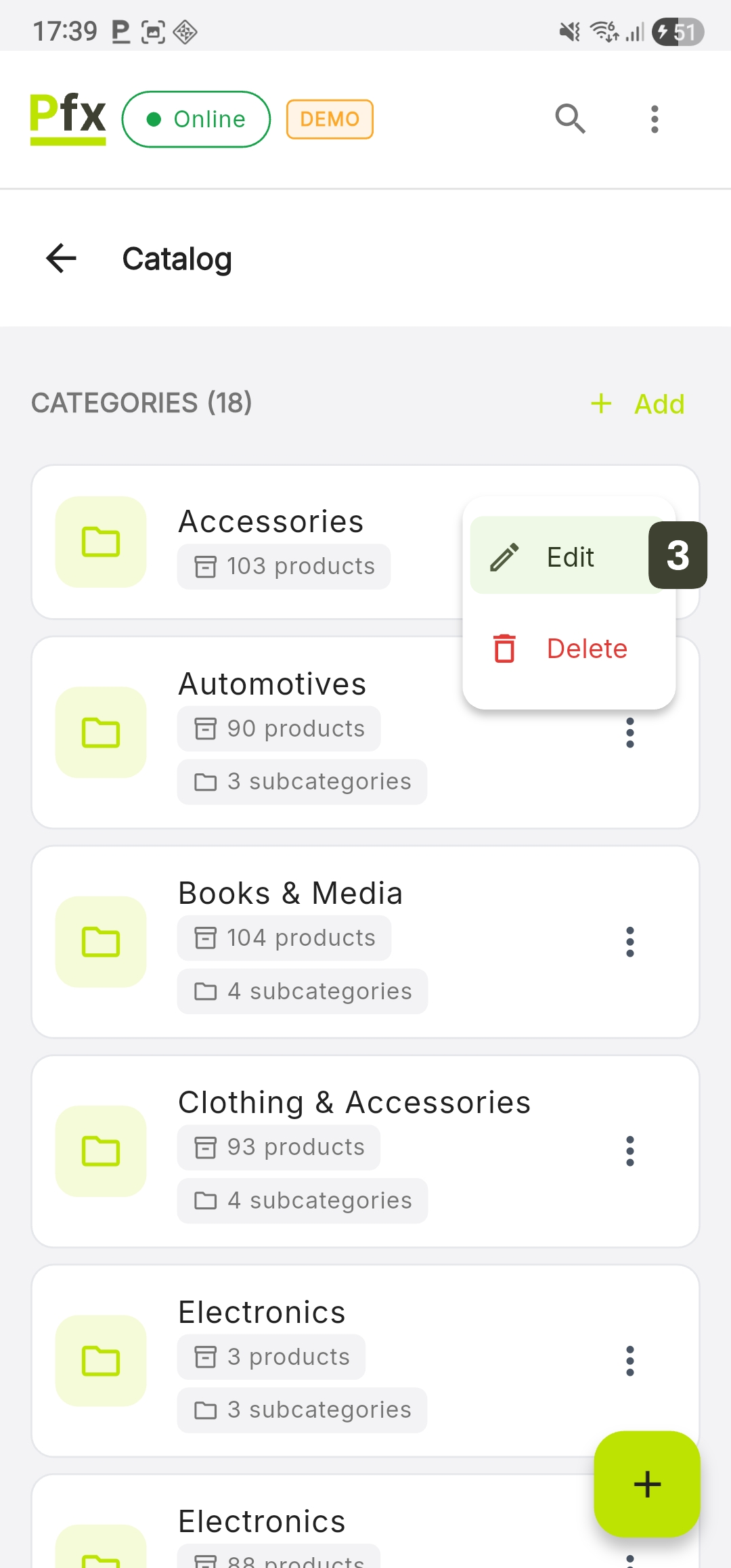 | Add button | Create new categories and products |