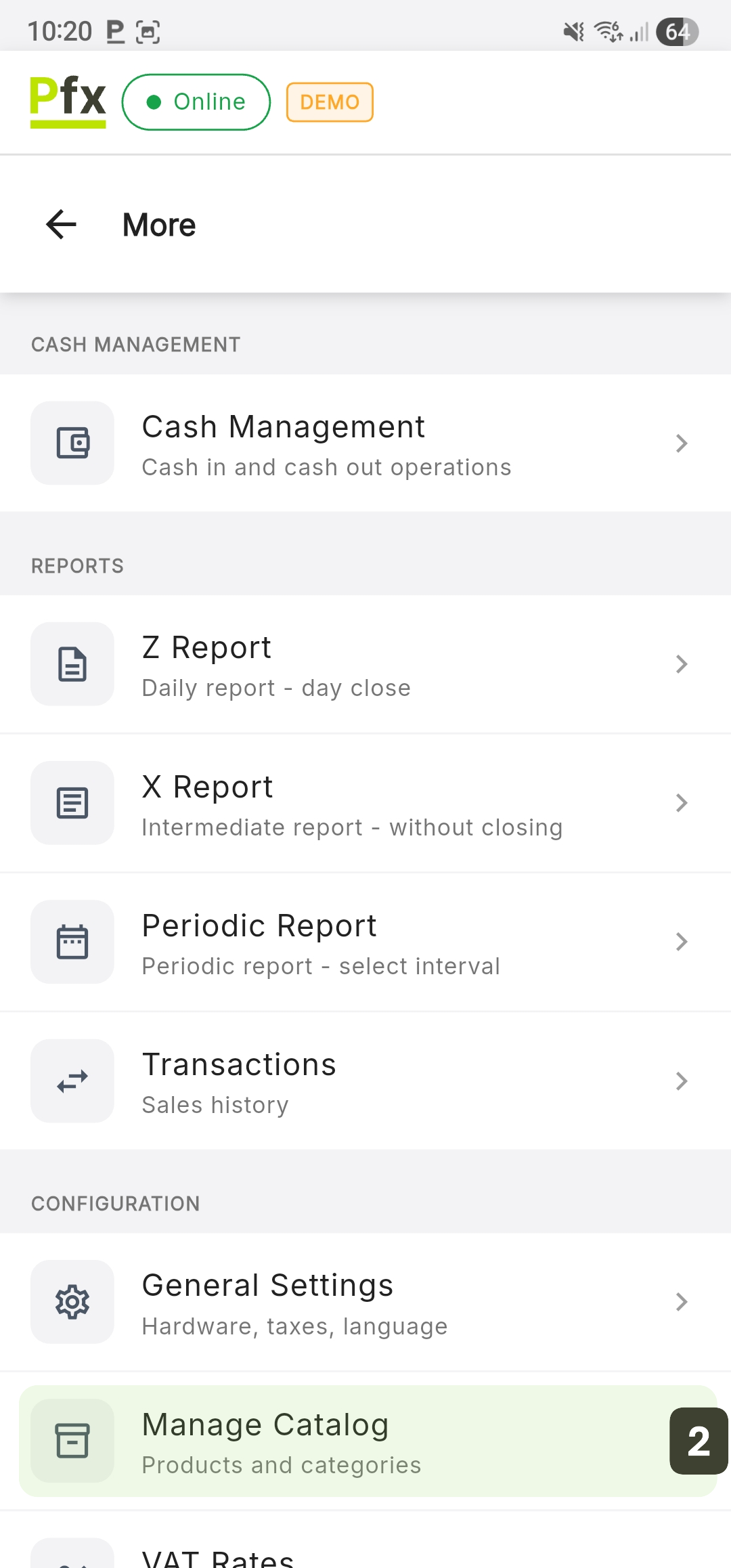 The Manage Catalog module is the control center for your inventory, allowing administration of the product list, category hierarchy, and VAT rate associations directly from the Android terminal.