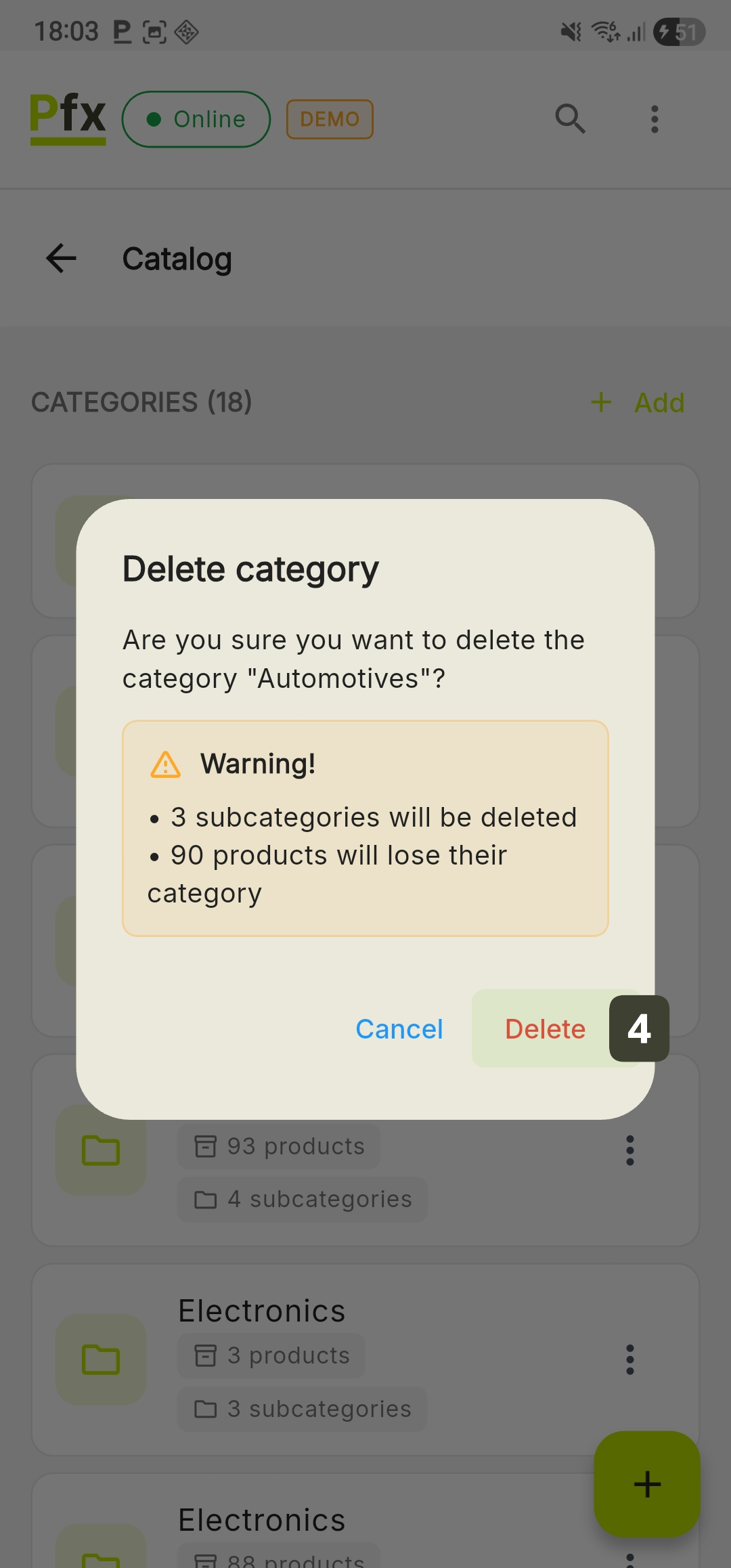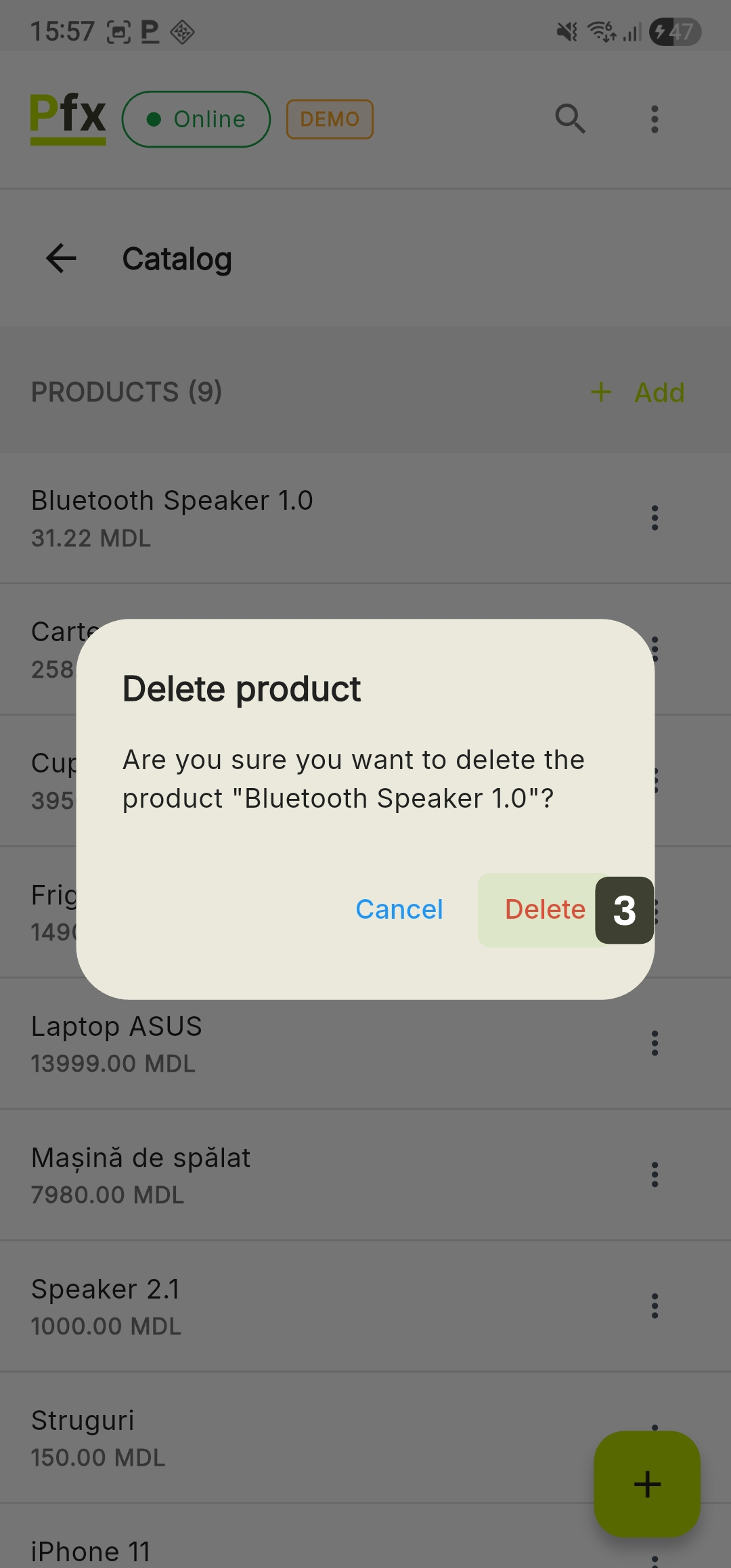 Locally irreversible action: Once confirmed, the deletion removes the product from the terminal interface.