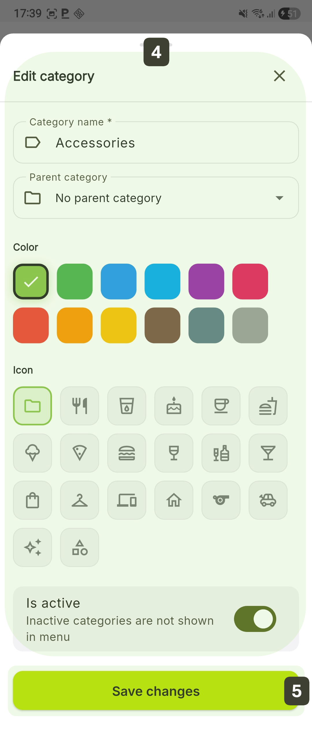 This function allows updating the name, changing the hierarchy (subcategory -> main category or vice versa), and visual customization to optimize the sales flow.