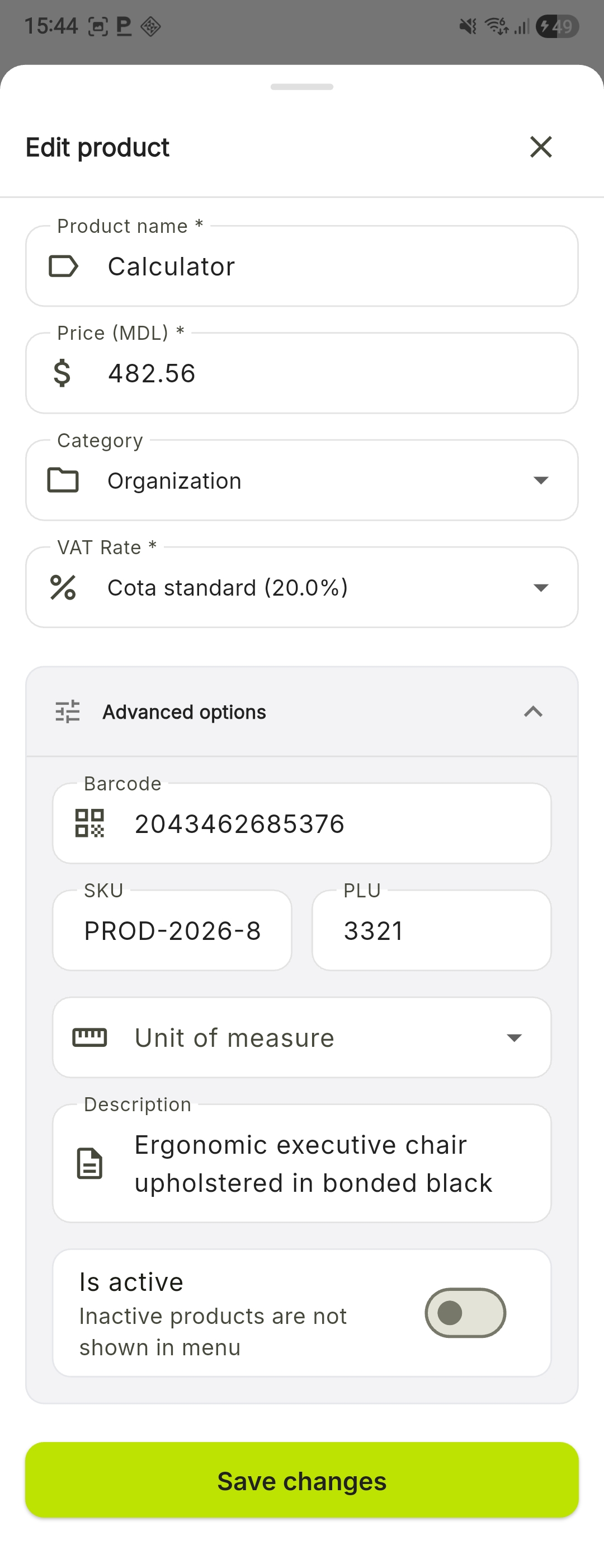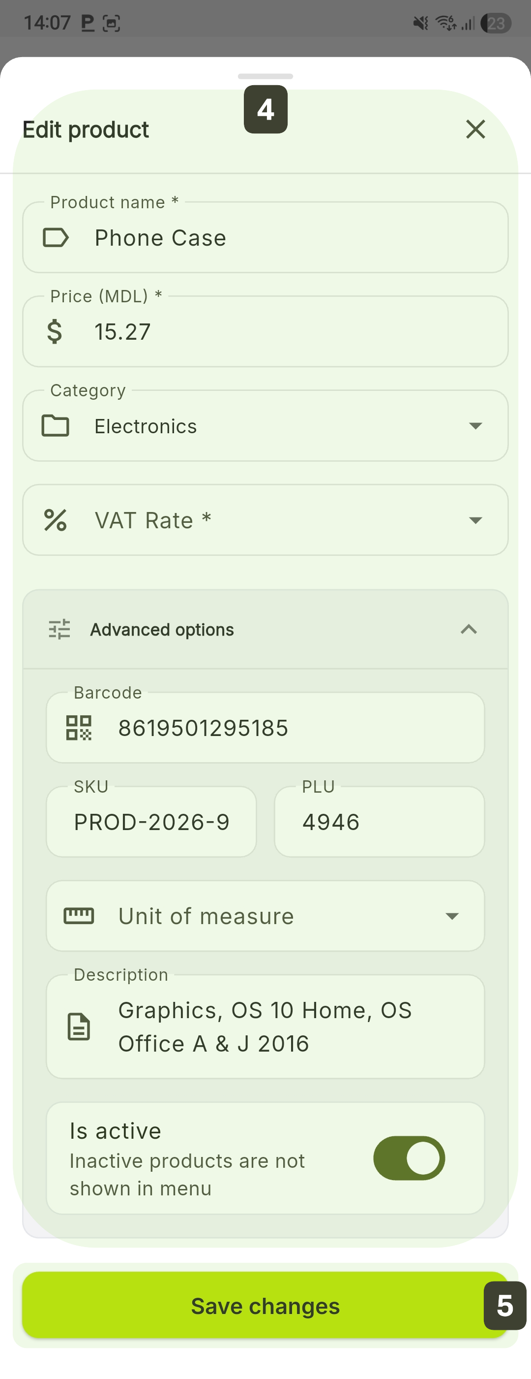 For the Barcode field, do not type the digits manually. Tap the field and scan the product with the scanner. This eliminates the risk of errors.