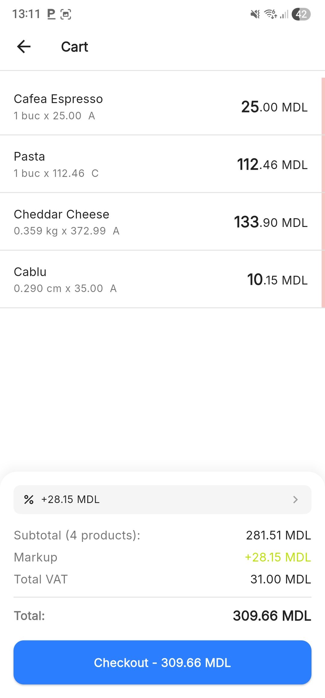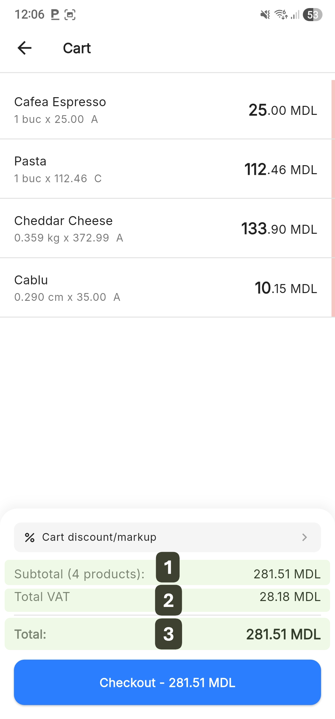 Verbally communicate the TOTAL amount to the customer before proceeding to payment: "Your total is 281,51 lei".