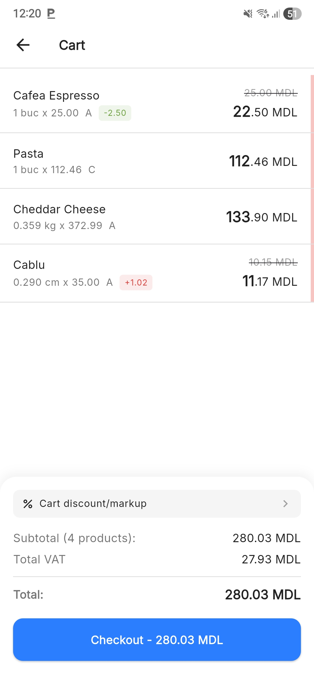 In the presence of these adjustments, the Subtotal remains constant as the gross sum of the products (without modifications), while the Total becomes the final calculated amount, including the cart discount/markup.