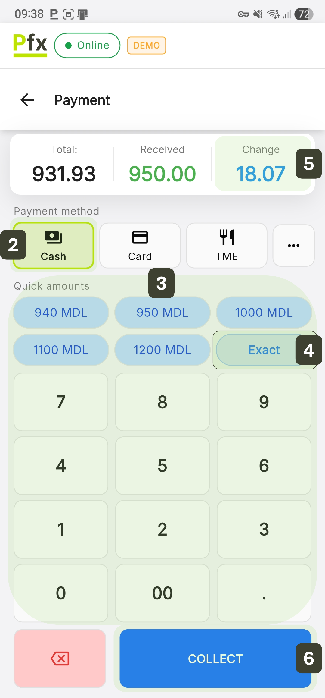 Cash payment is integrated with a change calculation system and adaptive quick amount buttons: