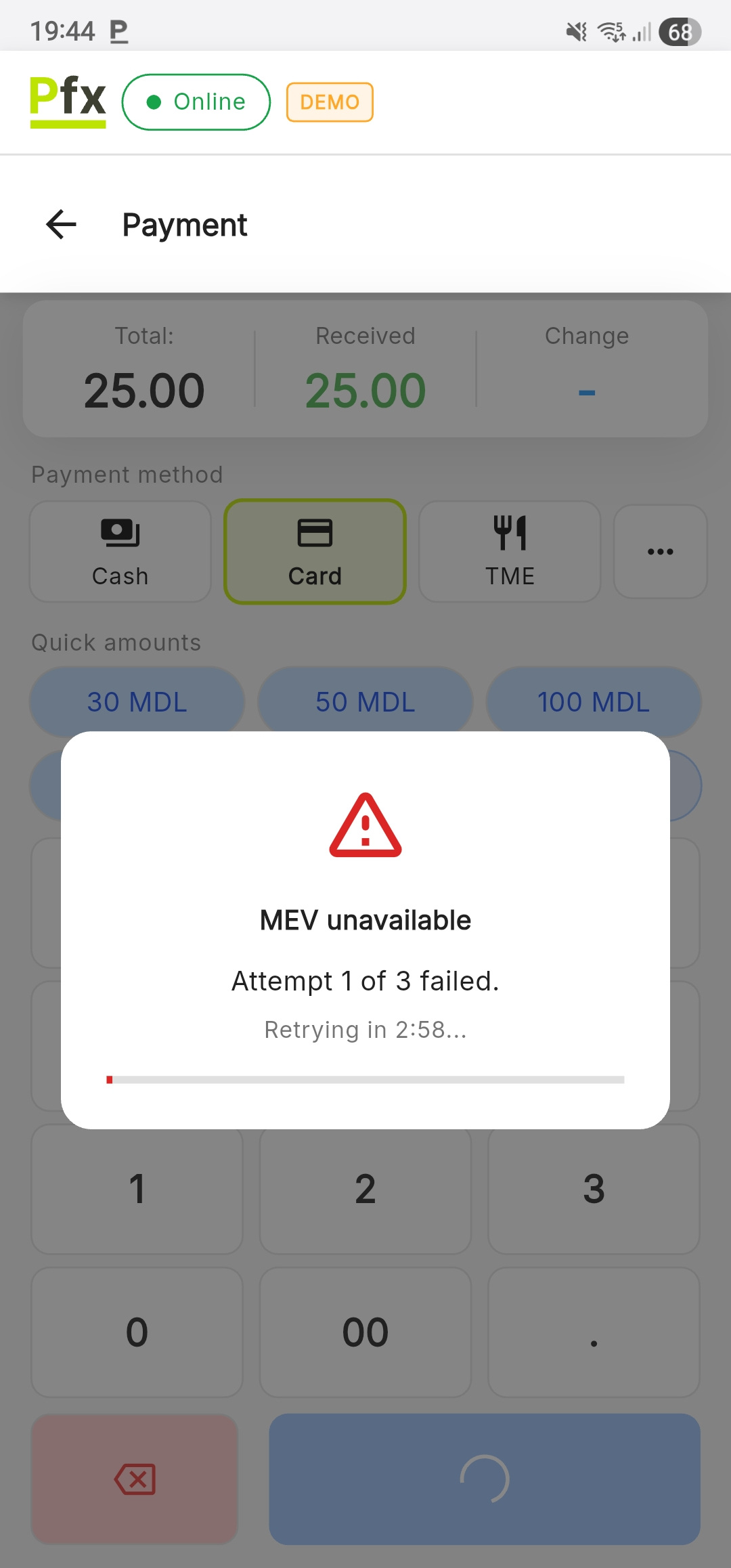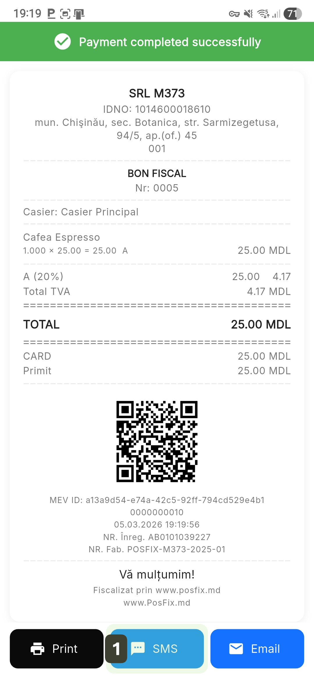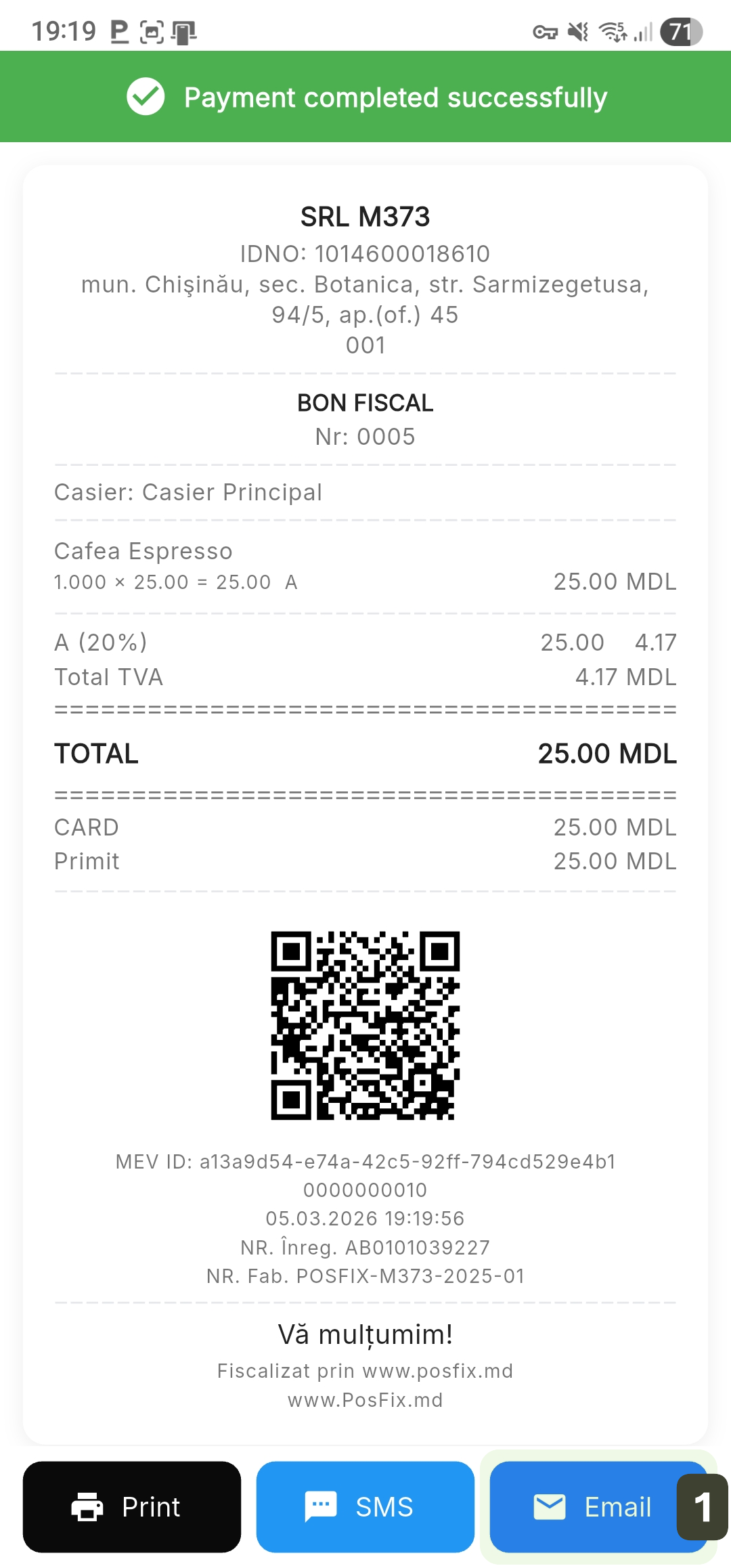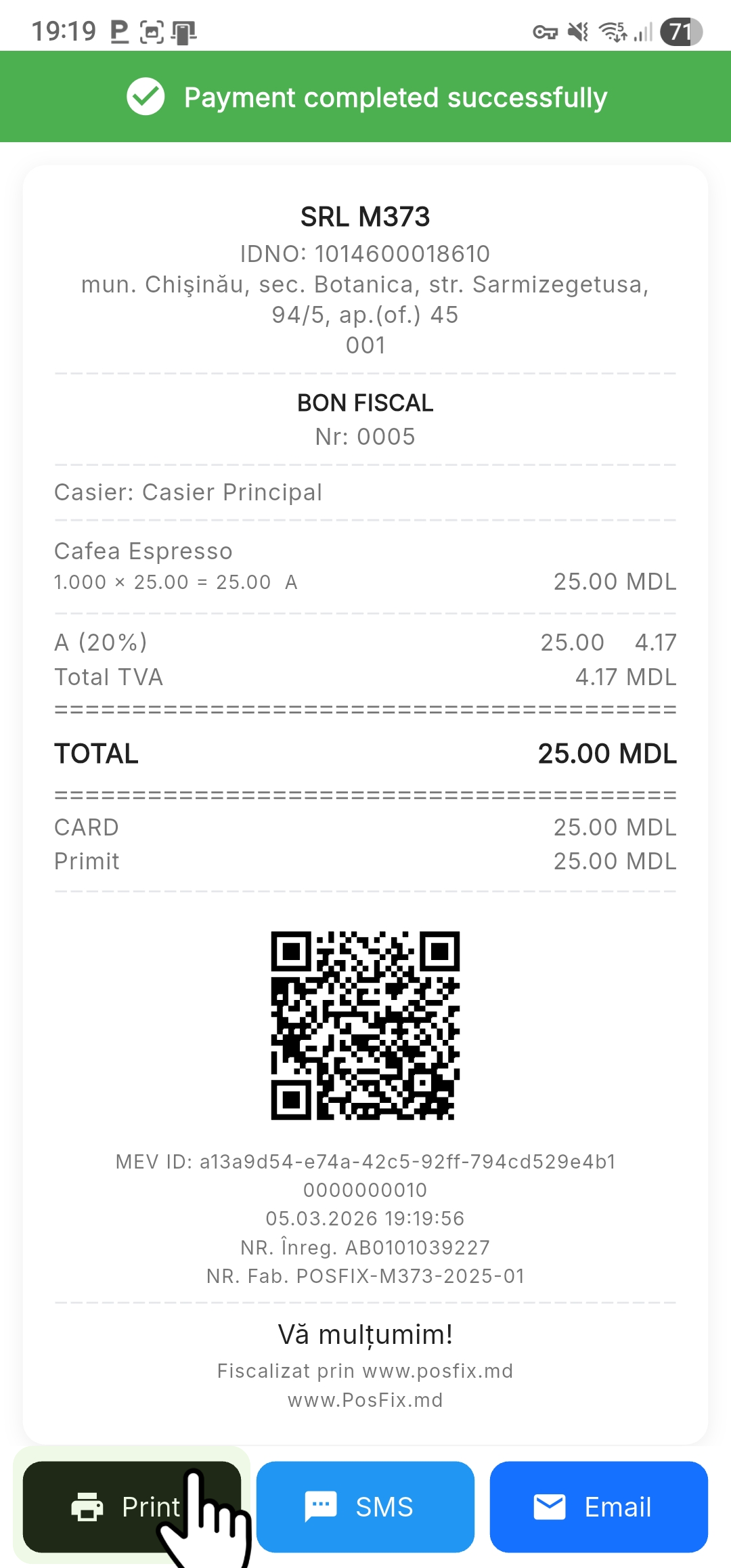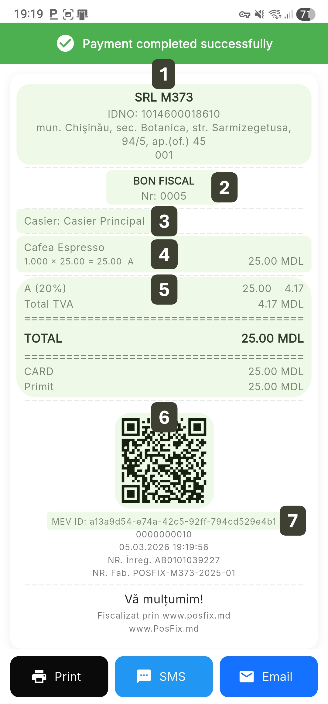 PosFix operates as a cash register and control device (ECC), fiscally recording all transactions in accordance with SFS Moldova requirements and electronically transmitting receipts through the MEV system.