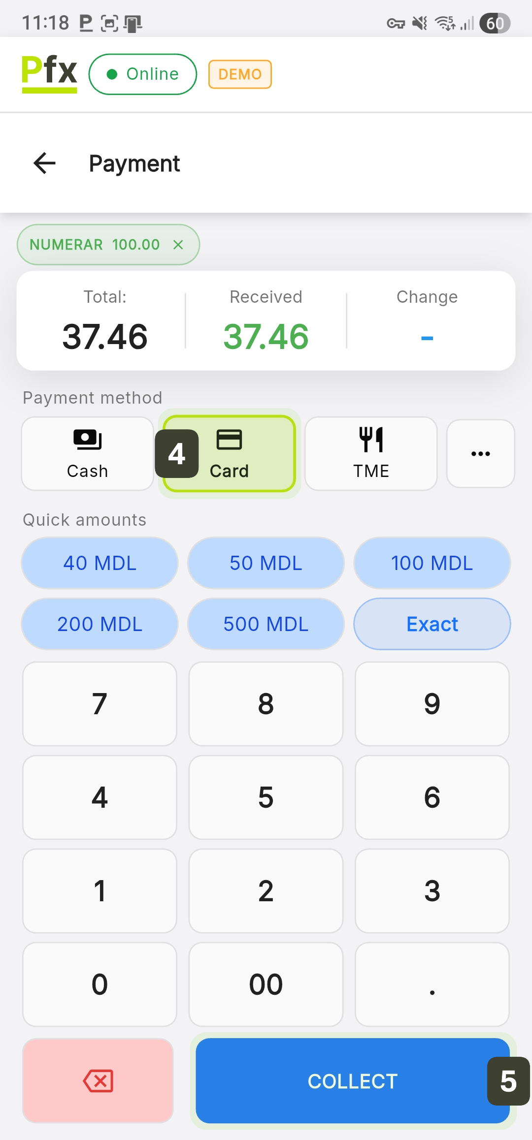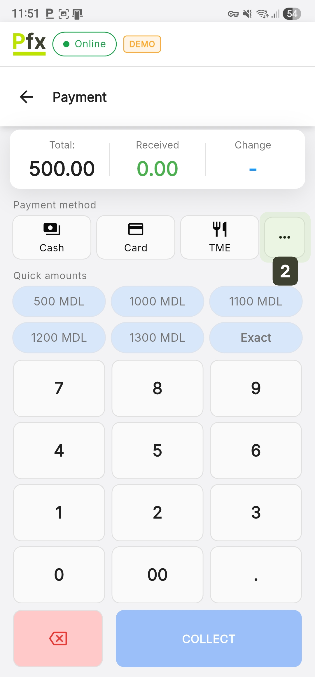 The system will automatically fill the Received field with the remaining amount balance. Ask the customer to tap their card/phone - After the transaction has been approved by the bank, press the COLLECT button to issue the fiscal receipt