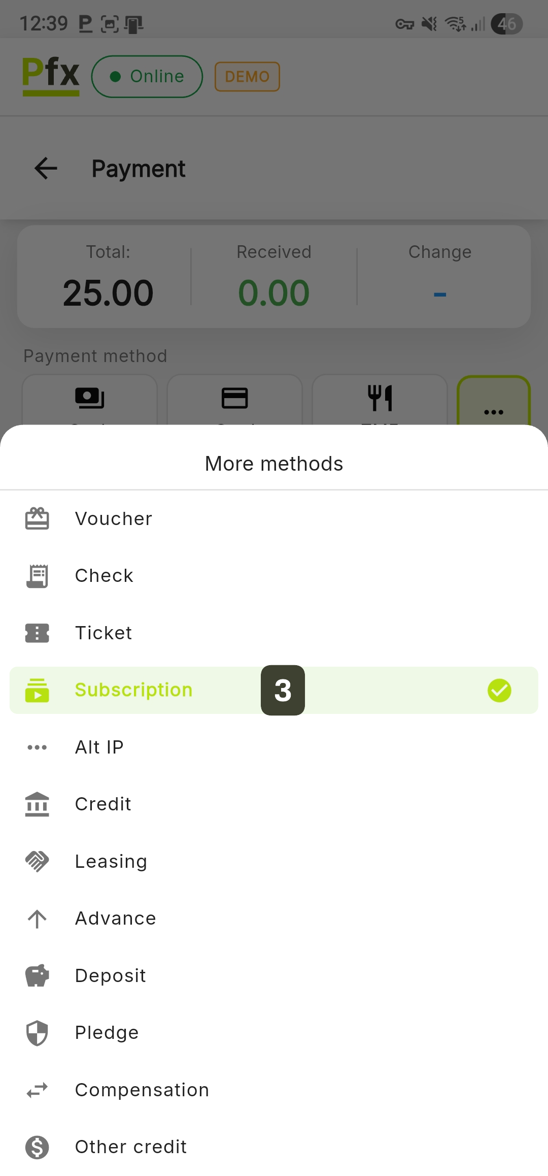 This method is used for loyal customers who hold an active subscription. Use this option to deduct the product value from a customer's existing subscription, without collecting cash at the time of sale.
