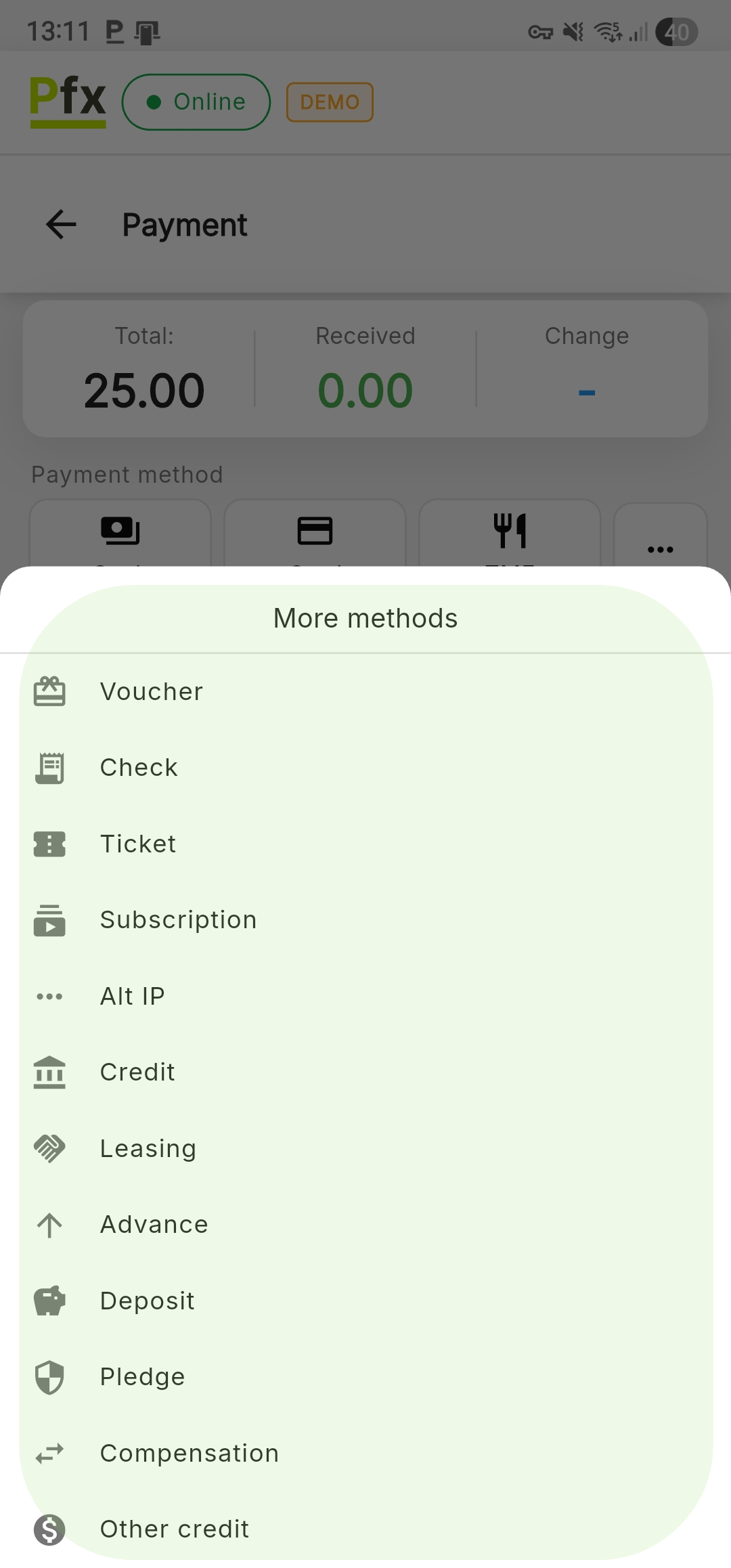 The PosFix system supports multiple payment methods. This section guides the operator through the process of finalizing a transaction, explaining how to use each available payment method.
