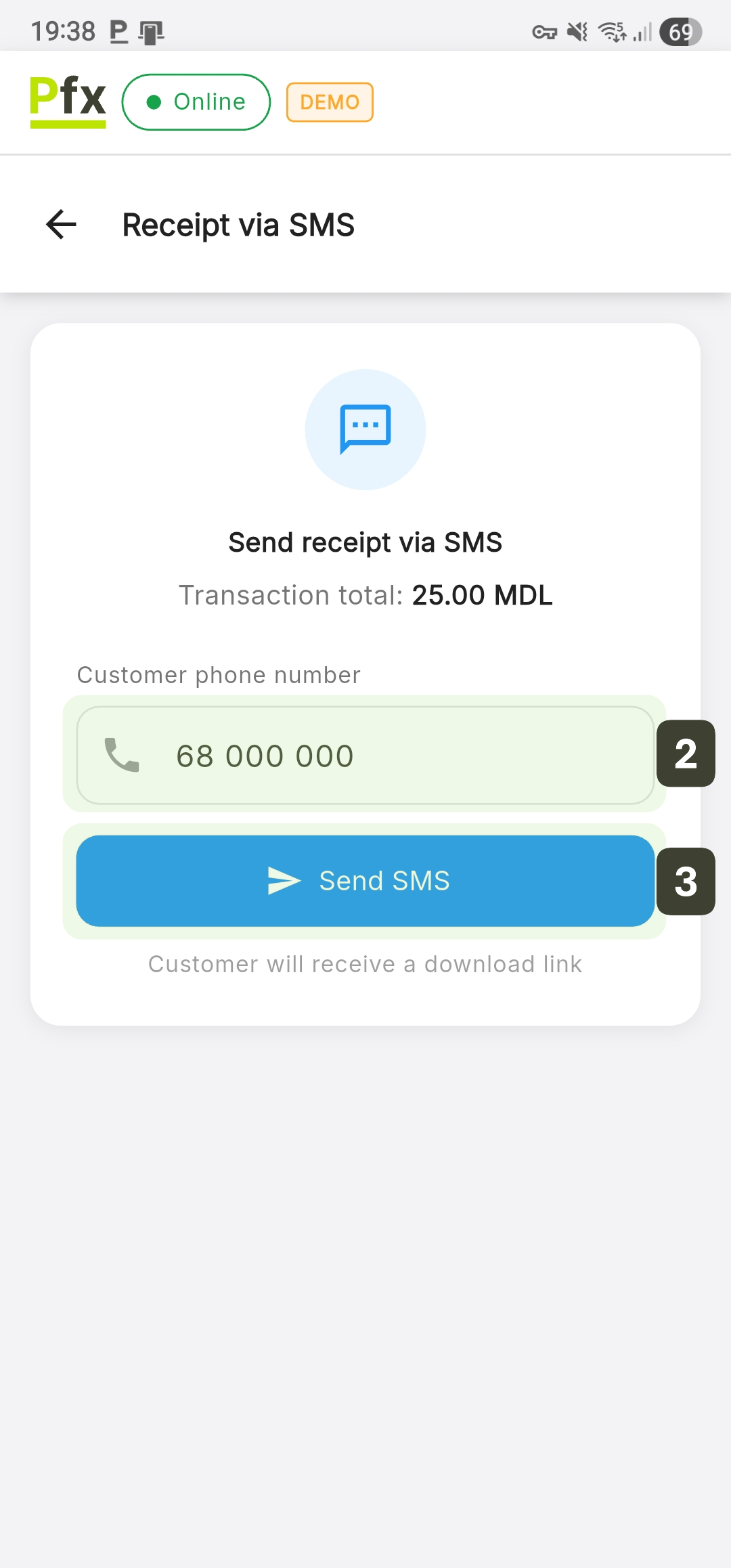 This feature allows sending a digital copy of the fiscal receipt directly to the customer's mobile phone, as an eco-friendly and quick alternative to the printed version.