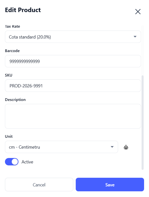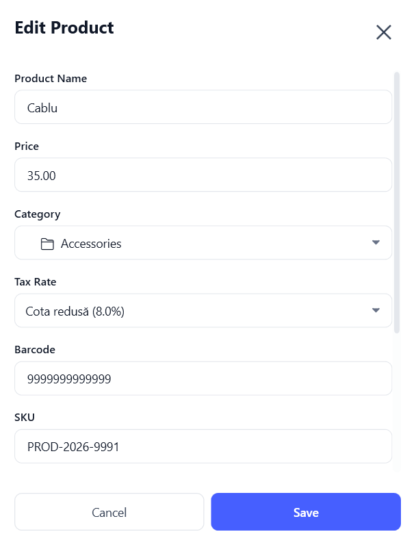 | Barcode | Optional | Scan or type the EAN/UPC code for scanner sales |