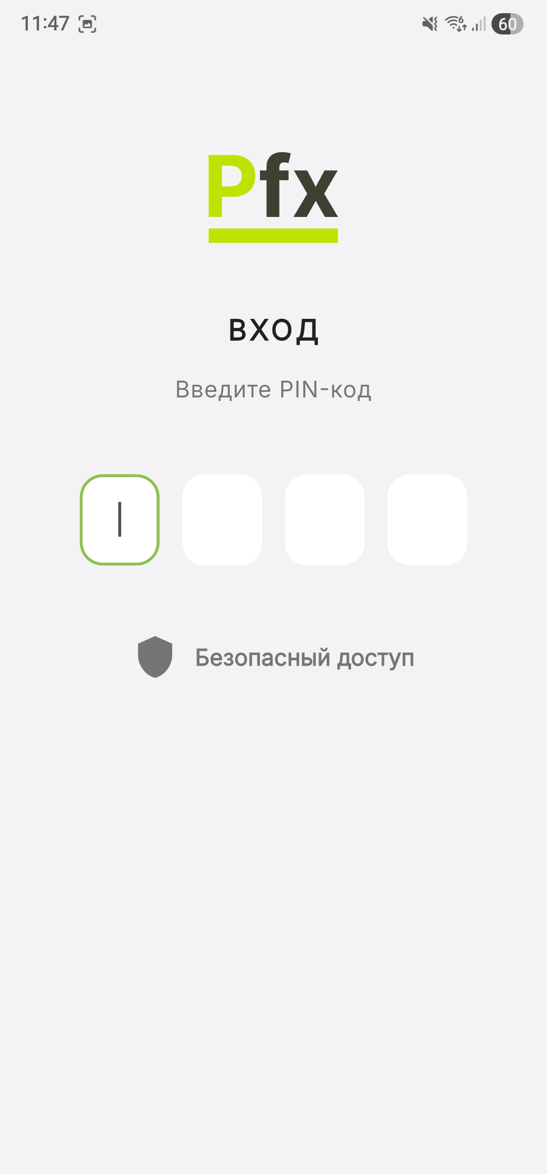 После активации терминала при каждом запуске приложения вы будете видеть экран аутентификации. Доступ осуществляется путём ввода персонального PIN-кода.
