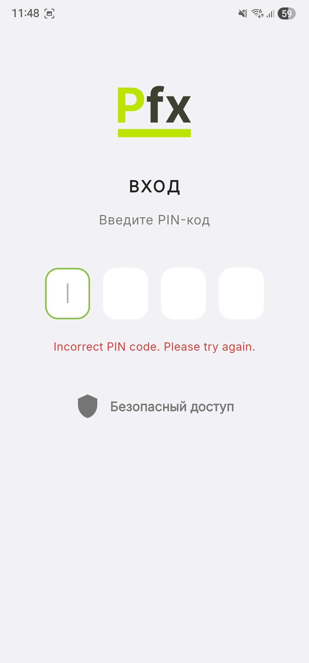 Доступ в систему происходит автоматически после ввода последней цифры без необходимости дополнительного подтверждения. - Если PIN-код неверный, появится сообщение об ошибке, и вы сможете ввести правильный код