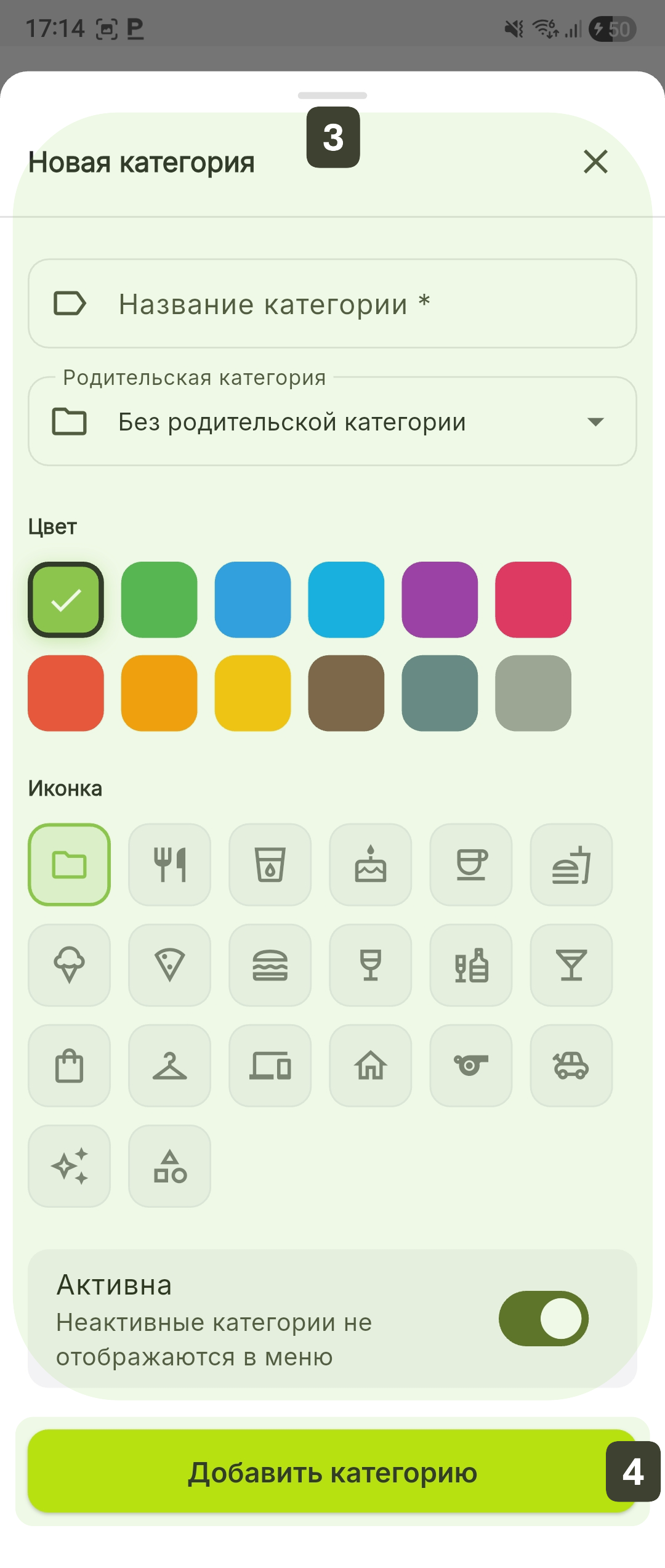 | Название категории | Введите наименование, которое будет отображаться на экране продажи |
