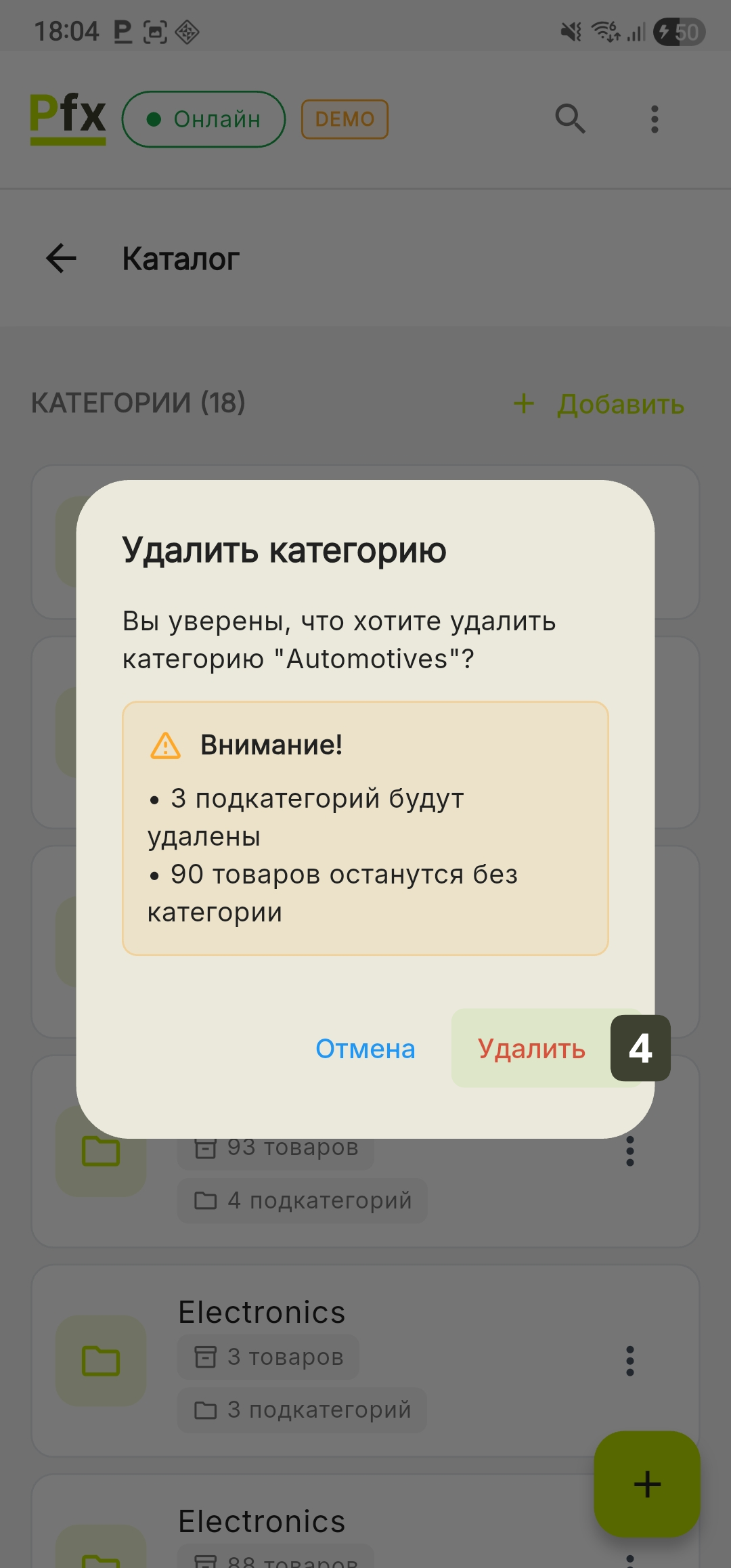 - На экране Каталог найдите категорию, которую хотите удалить.