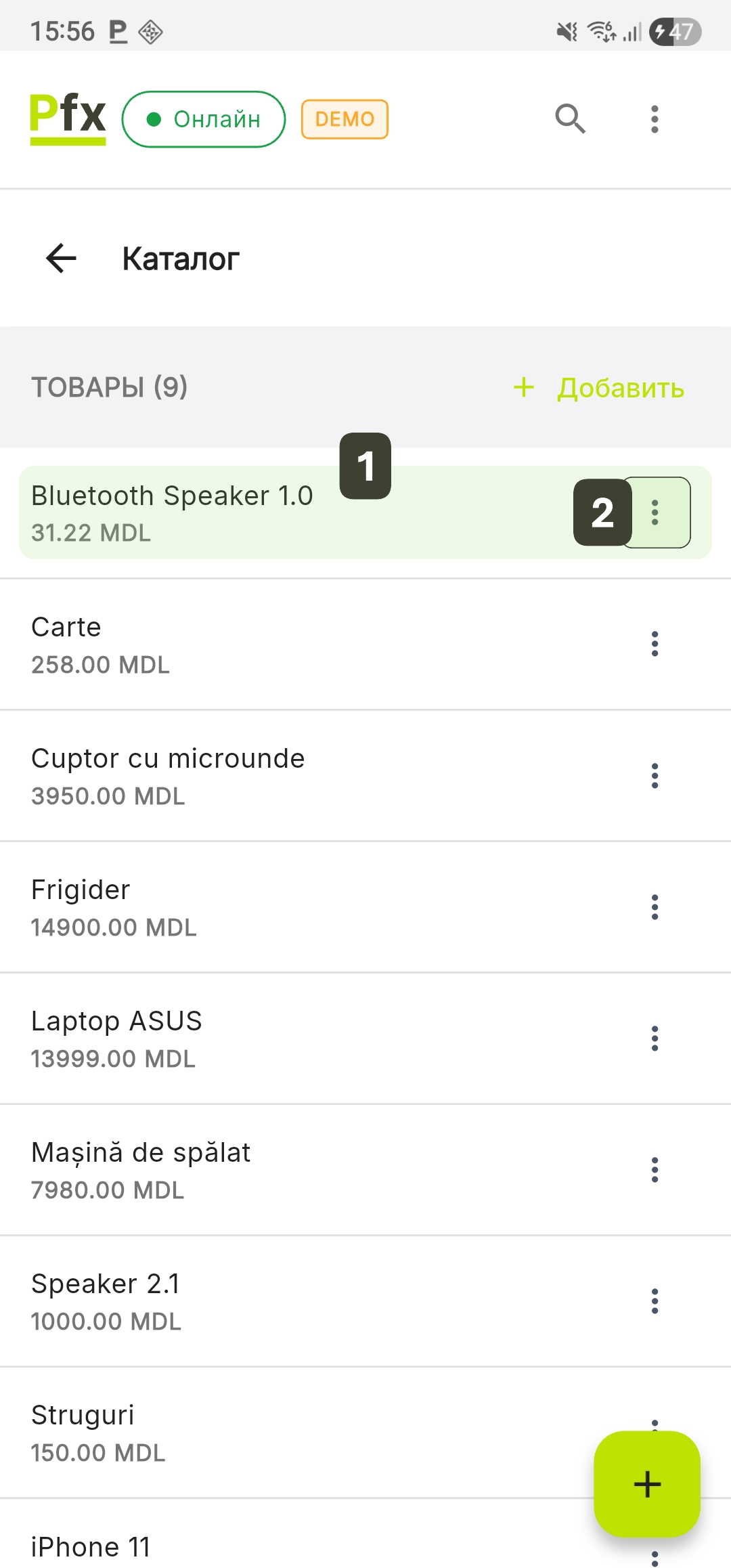 На вкладках Каталог или Избранное используйте долгое нажатие (Long Press) на любом товаре для перехода к экрану редактирования.