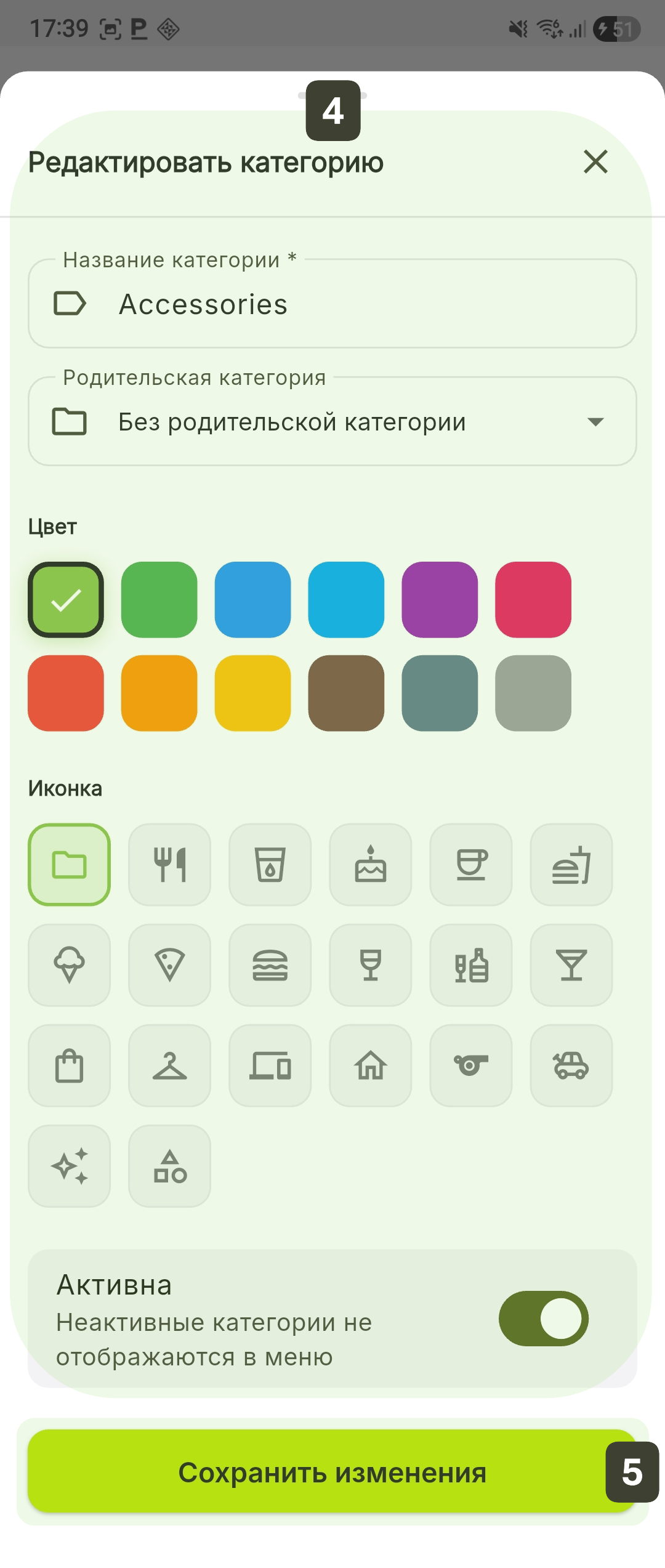 Эта функция позволяет обновить название, изменить иерархию (подкатегория -> основная категория или наоборот) и настроить визуальное оформление для оптимизации процесса продажи.