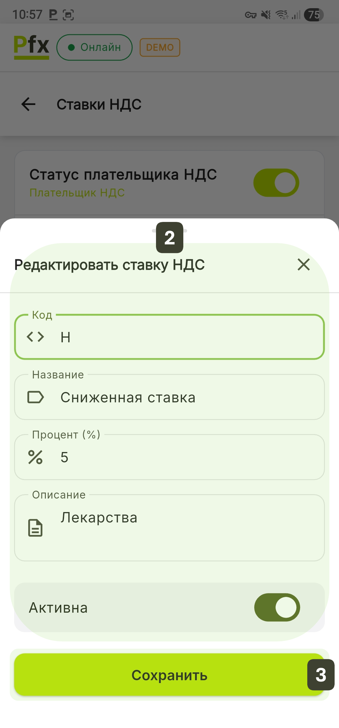 - Нажмите Добавить ставку НДС для сохранения изменений