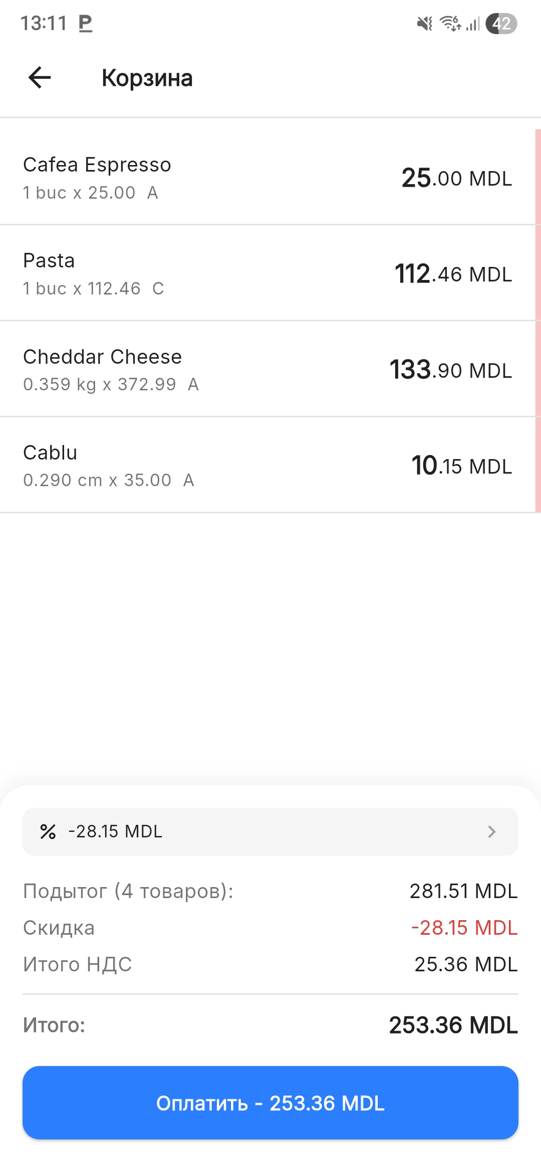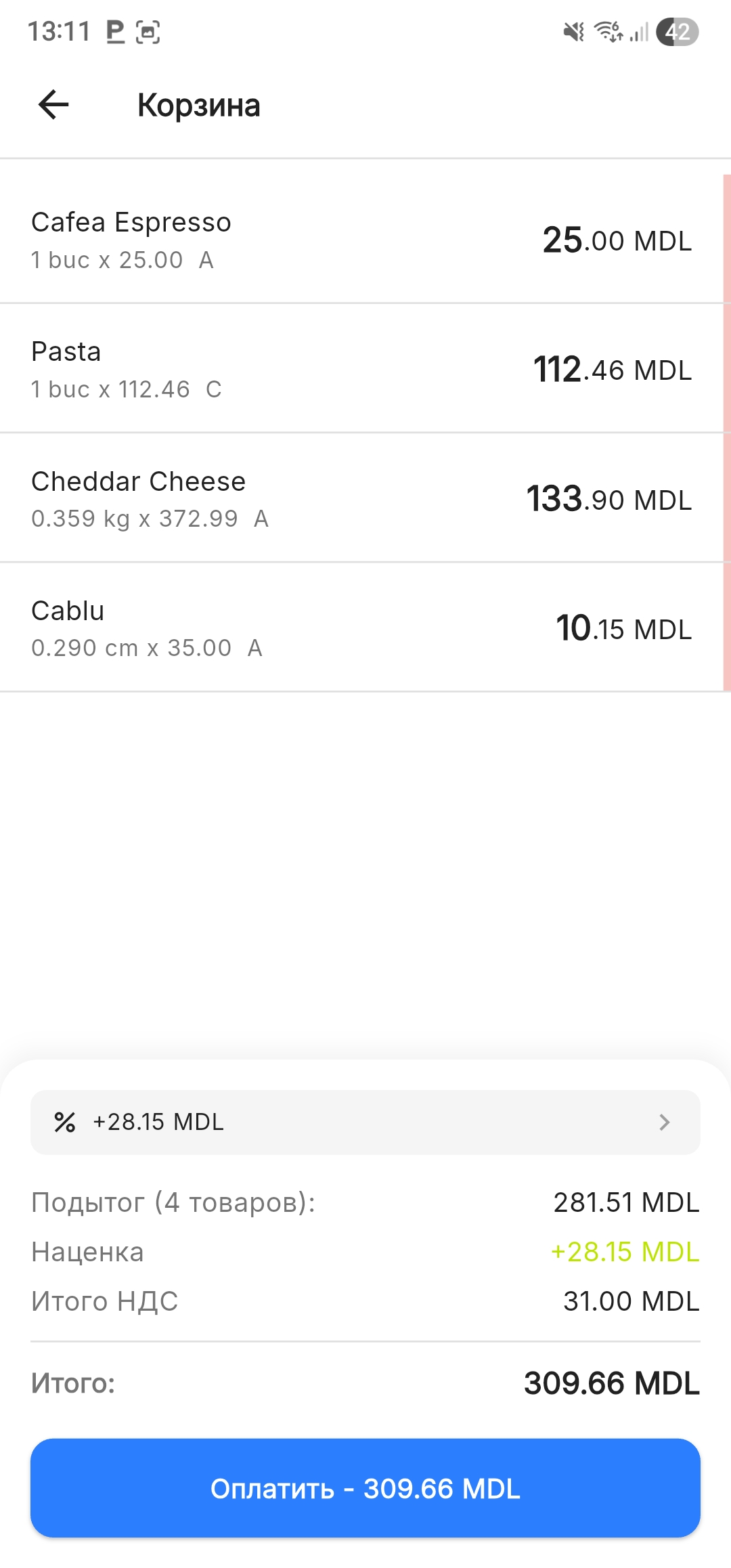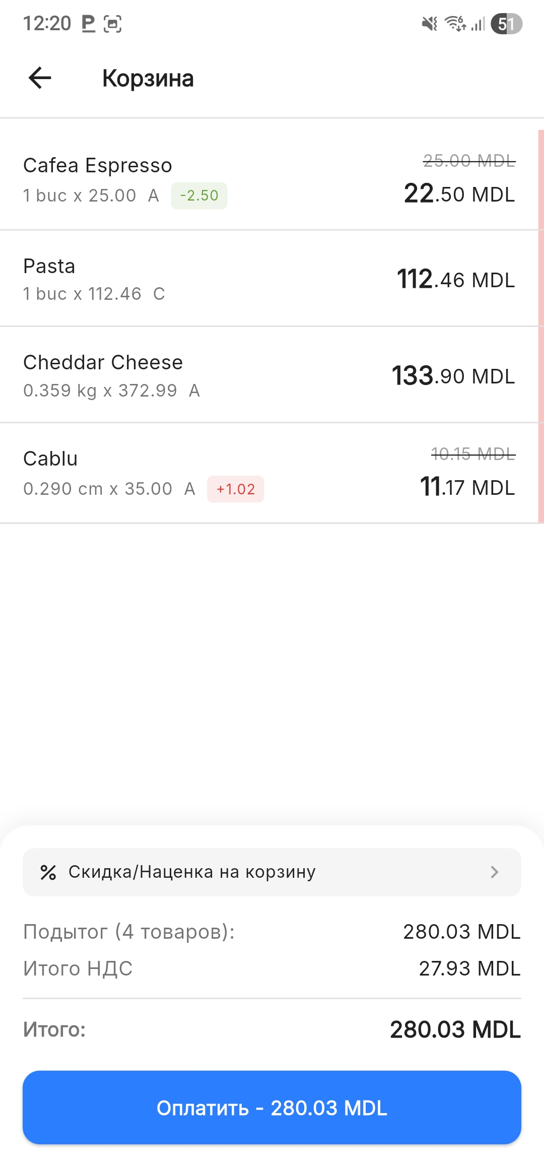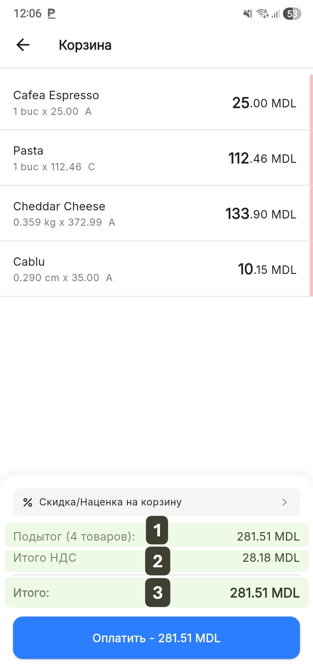 Сообщите клиенту сумму ИТОГО перед переходом к оплате: «К оплате 281,51 лей».